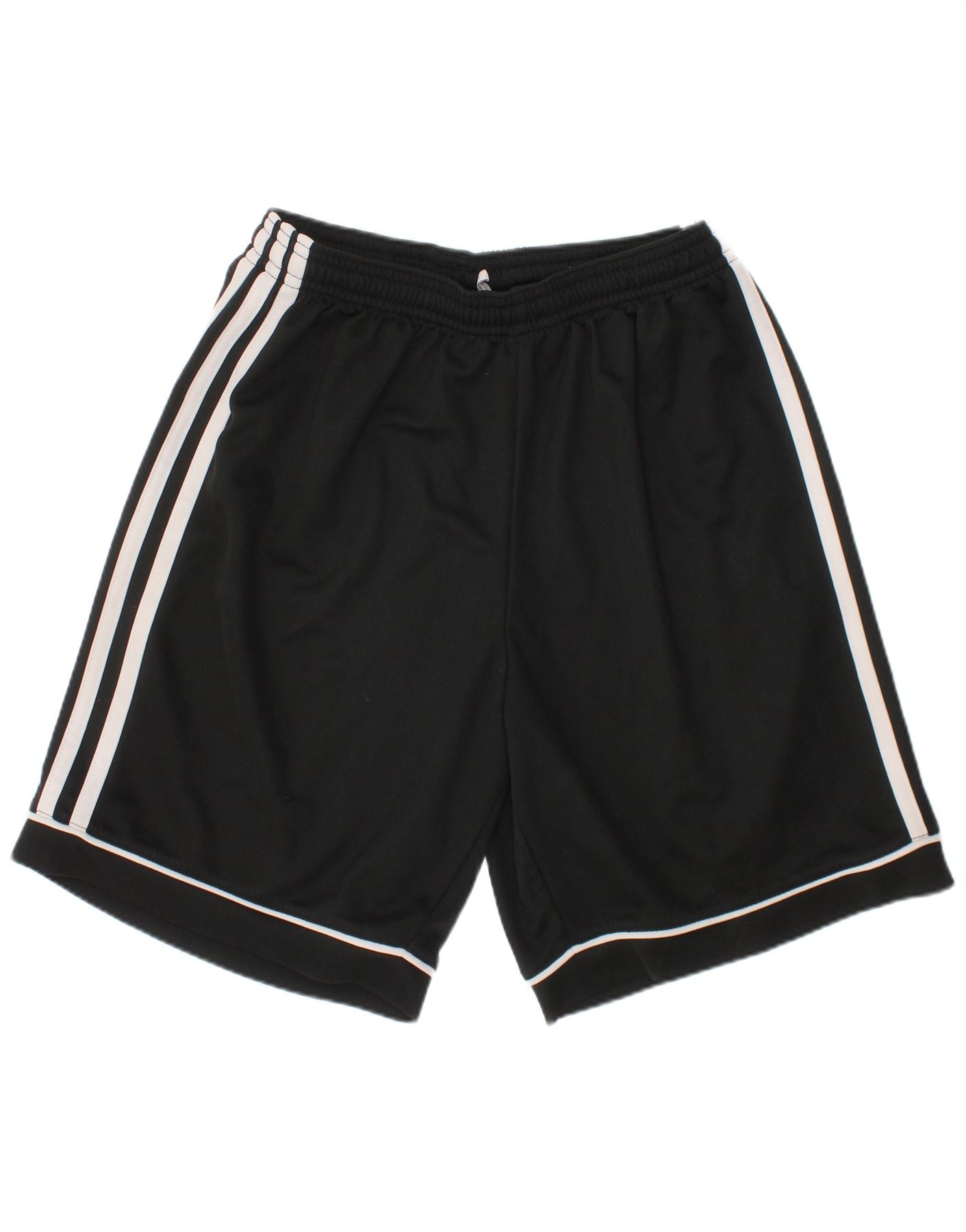 - AI Description: This Adidas boys shorts are crafted from lightweight, breathable black polyester jersey. They feature an elasticated pull-on waist for a comfortable, athletic fit. The regular cut ensures ease of movement. Classic white stripes run down each side, adding a signature sports detail. The hem is neatly finished. Designed for active wear, these shorts offer both comfort and style for young athletes.