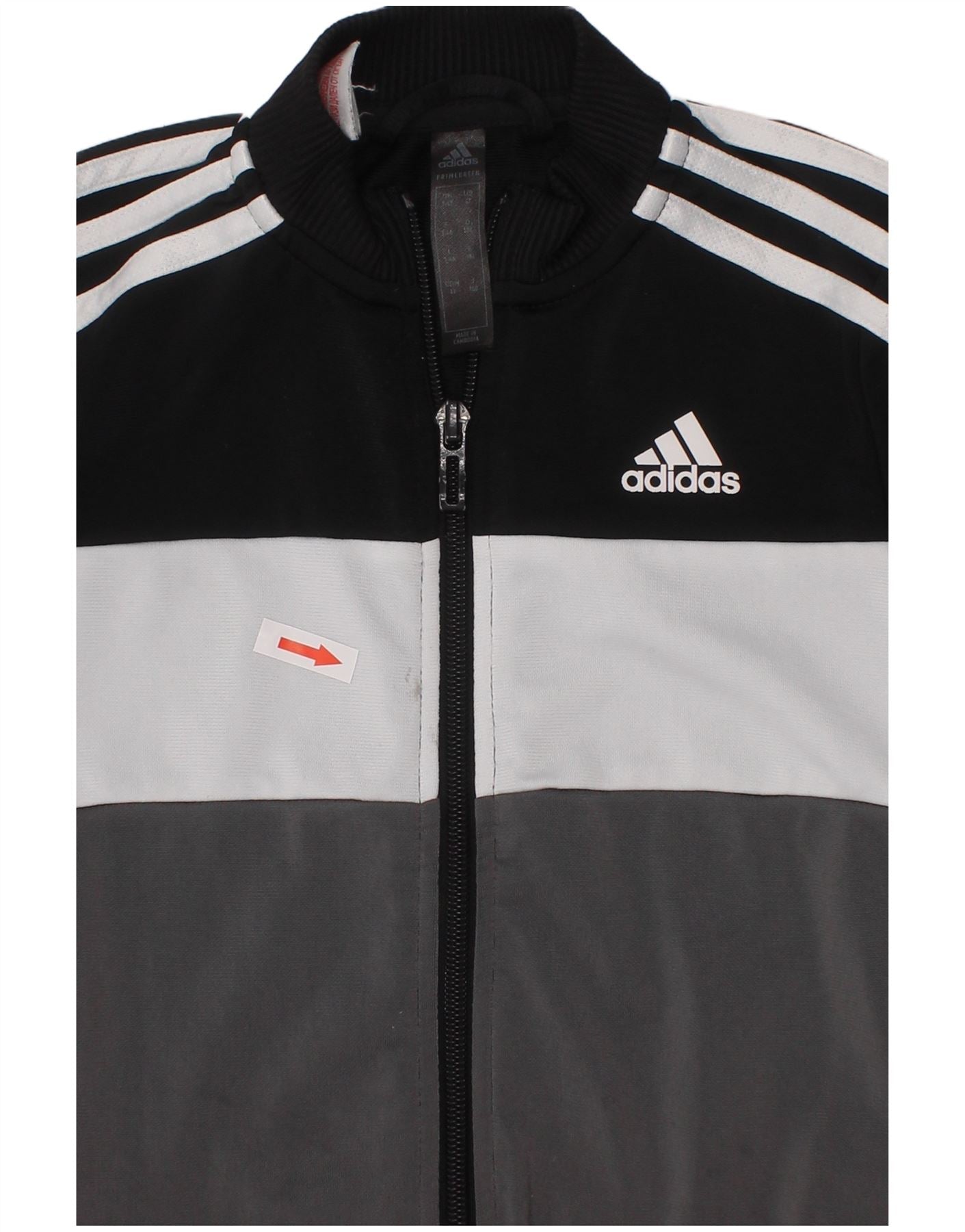 - AI Description: This Adidas boys tracksuit top jacket is crafted from smooth polyester jersey. It features a striking multicoloured colourblock design in black, white, and grey. The collared neckline and full zip closure offer a classic athletic look. Long sleeves finish with comfortable ribbed cuffs. A regular fit ensures ease of movement for active wear. The iconic Adidas logo adds a signature branded detail.
