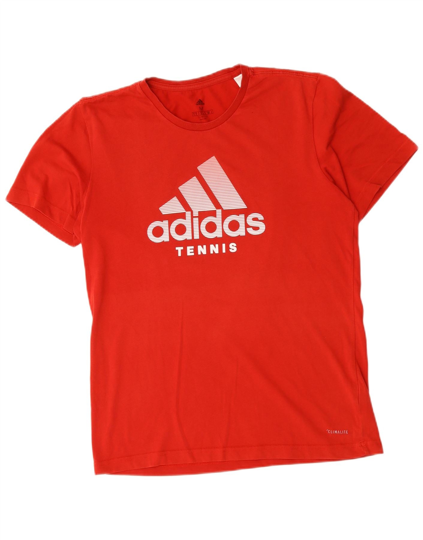- AI Description: This Adidas mens Graphic T-Shirt Top is crafted from lightweight red jersey fabric. It features a classic round neck and short sleeves. The regular fit ensures comfort and ease of movement. A prominent white Adidas logo with TENNIS lettering adorns the front. Climalite technology makes it breathable and comfortable for sports.