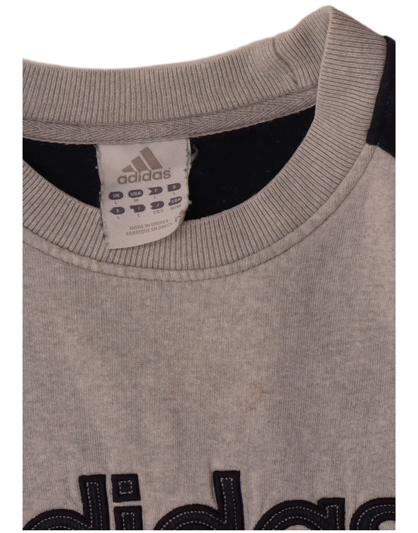 - AI Description: This Adidas men's sweatshirt jumper is made from soft cotton knit in a grey colourway. It features a classic round neckline and long sleeves. The pullover design offers a regular fit for comfortable wear. A striking colourblock pattern adorns the shoulders, complemented by a bold graphic Adidas logo across the chest. This sports-style jumper is ideal for casual layering.