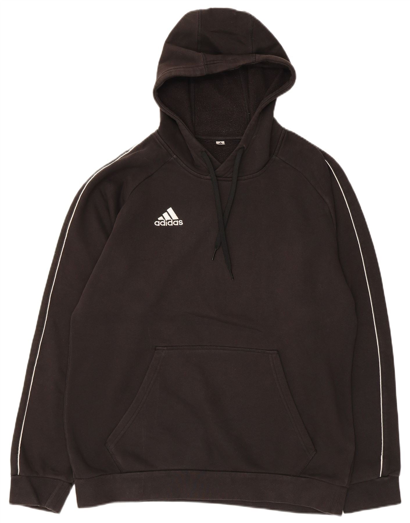 - AI Description: This Adidas mens Hoodie Jumper is crafted from a soft black cotton blend jersey. It features a comfortable hooded neckline and long sleeves with ribbed cuffs. The pullover design offers a regular fit for everyday wear. A prominent white piping detail runs along the sleeves, complementing the iconic Adidas logo on the chest. A practical kangaroo pocket completes this classic sports style.