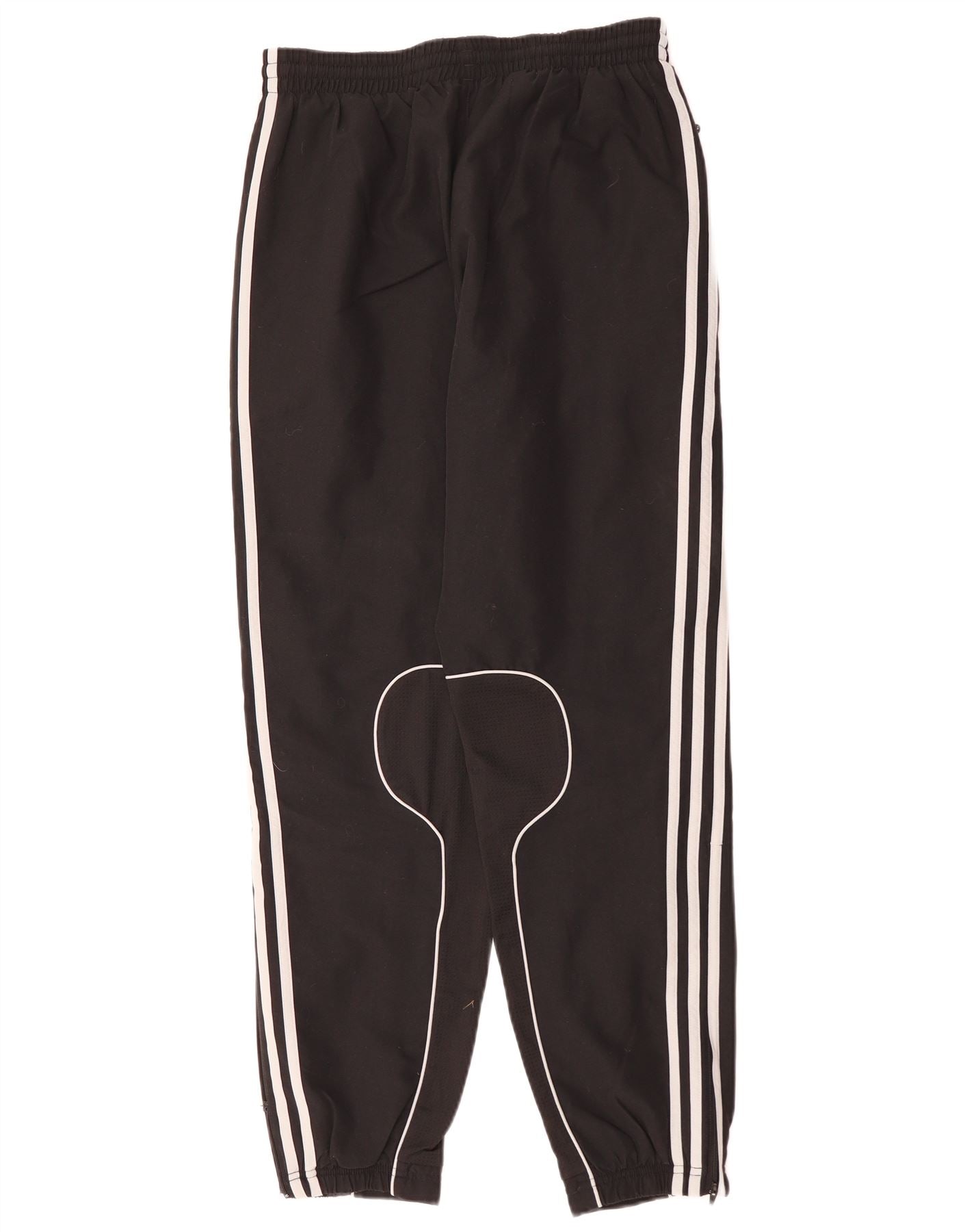 - AI Description: These Adidas men's tracksuit trousers joggers are crafted from smooth black 100 percent polyester. They feature an elasticated pull-on waist for comfort. The athletic regular fit offers ease of movement. White stripes run down the sides, complementing the Adidas logo. A Liverpool FC crest is proudly displayed. Practical pockets and ankle zips complete the design.