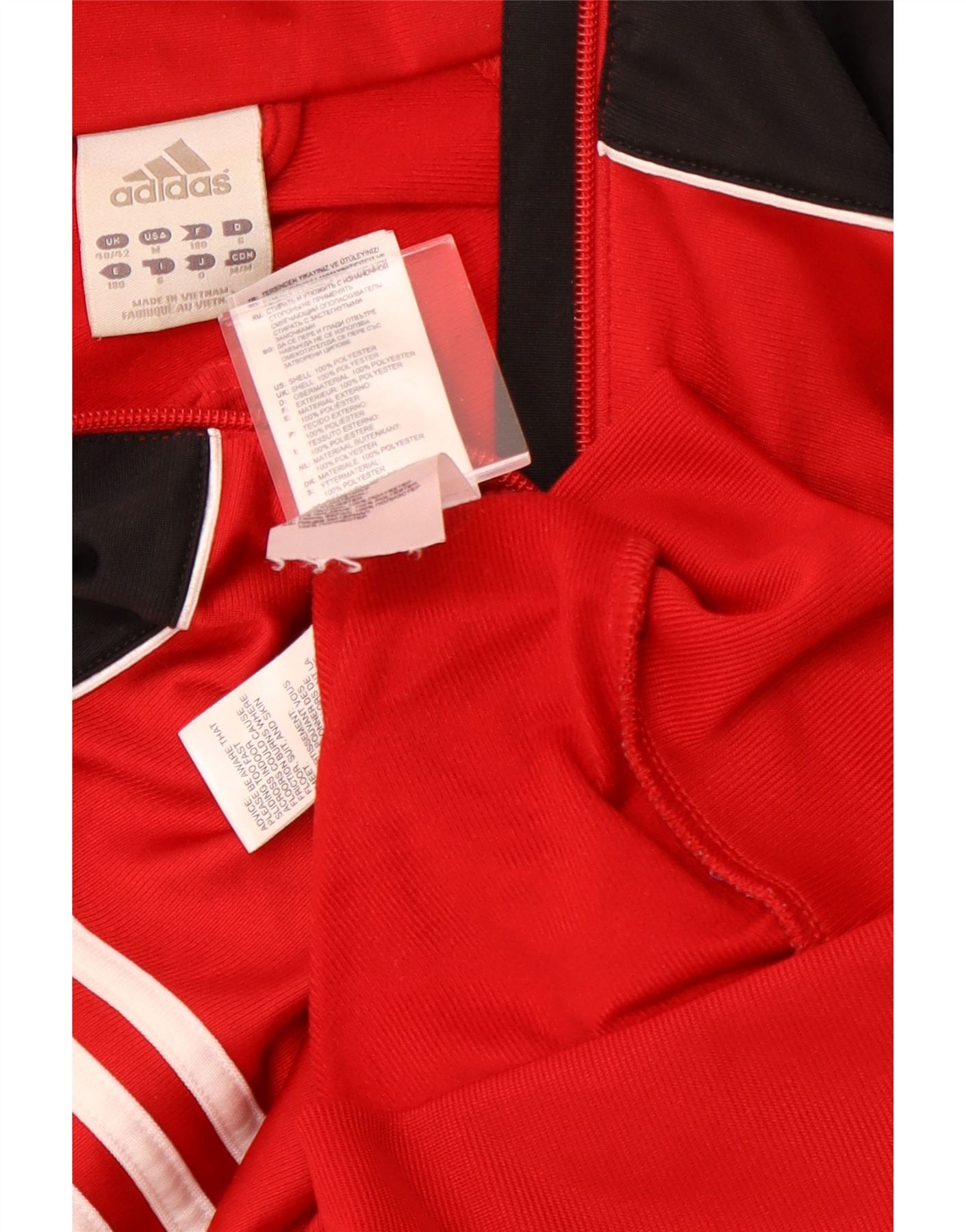 - AI Description: This Adidas men's tracksuit top jacket is made from 100% polyester with a smooth finish. It features a striking red and black colourblock pattern. The collared neckline and full zip closure offer versatile wear. Long sleeves and a regular fit ensure comfort and ease of movement. Iconic Adidas stripes accent the sleeves, adding a sporty graphic detail. This lightweight jacket is ideal for football or general sports activities.