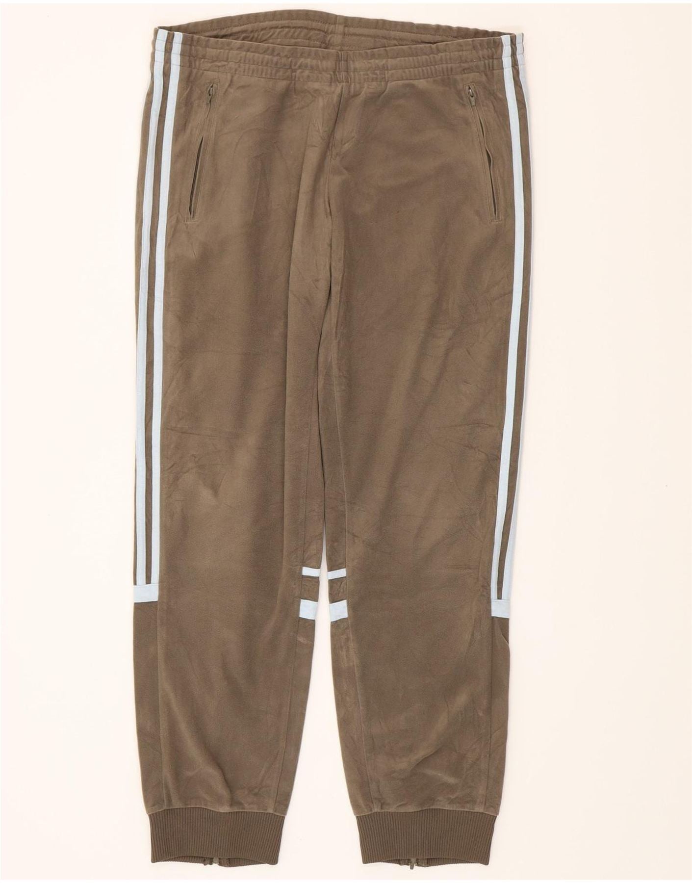 - AI Description: This Adidas womens tracksuit trousers joggers are crafted from soft khaki velour. The 100 percent polyester fabric offers a luxurious texture. They feature a comfortable pull on elastic waist for an easy fit. Cuffed ankles and practical pockets add functional detail. A subtle logo accent completes the regular comfort fit design.