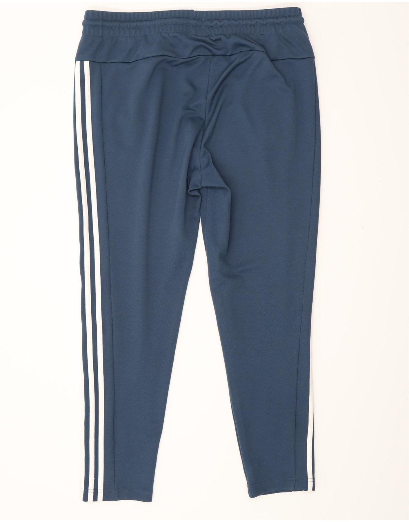 - AI Description: This Adidas womens casual trousers are crafted from a smooth navy blue blended fabric, ideal for training. The pull on style features an elasticated waist with a drawstring for an athletic fit. White three stripe detailing runs down each leg, complementing the subtle Adidas logo. Side pockets add practicality to this comfortable jogger design.