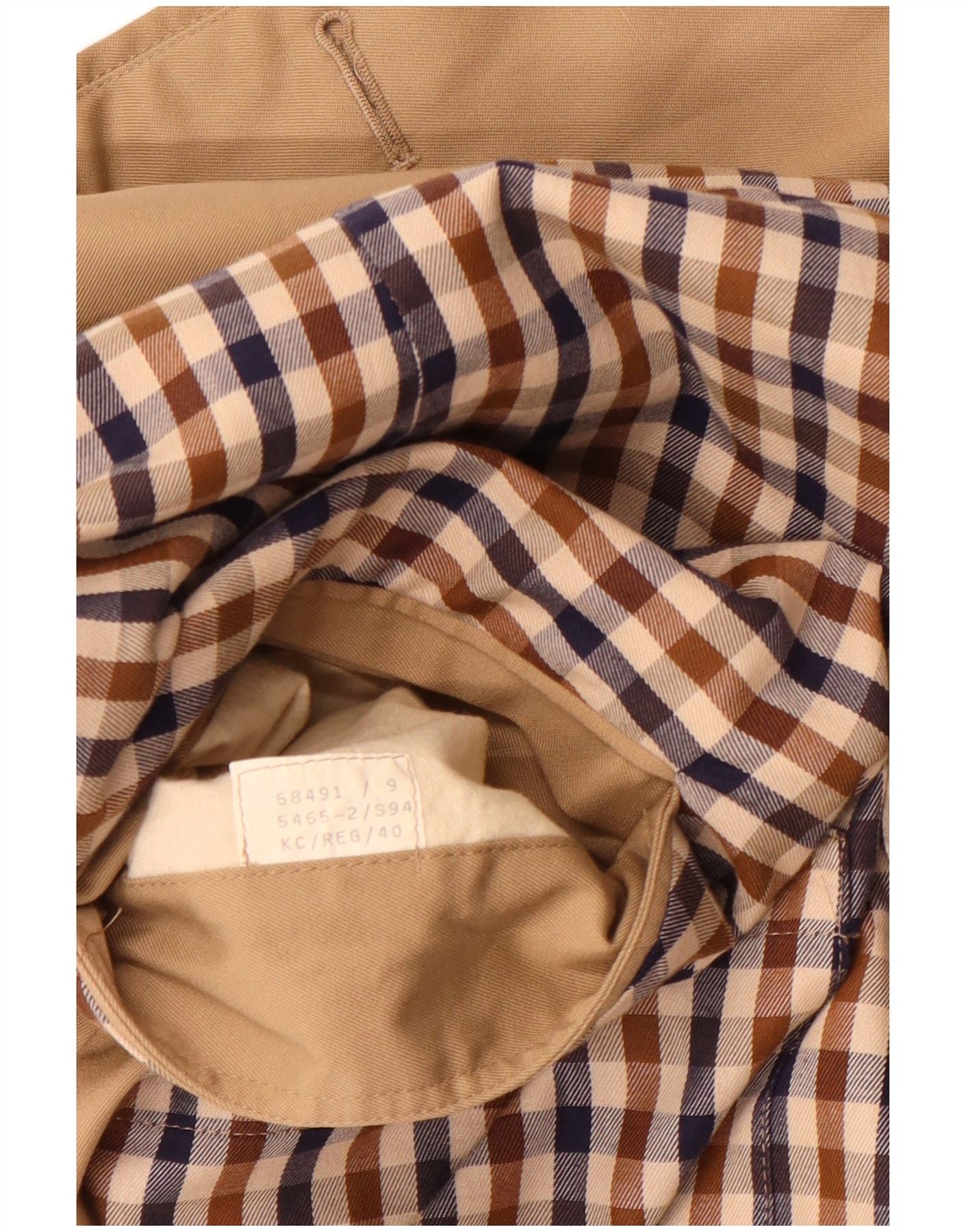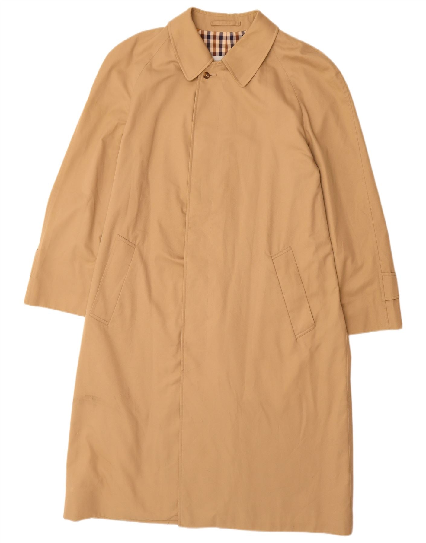 - AI Description: This Aquascutum mens trench coat is crafted from a beige woven fabric, offering a classic, refined texture. It features a collared neckline and long sleeves. The classic fit ensures a timeless silhouette. A subtle check pattern adds sophisticated visual interest. Button closures and button accents provide traditional detailing. This coat is water resistant, lined, and includes practical pockets, blending elegance with functionality.