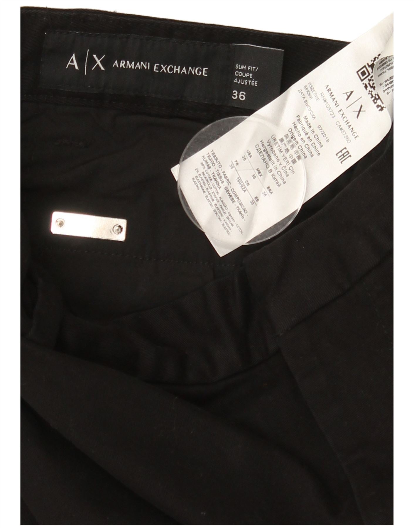 - AI Description: These Armani Exchange mens chino trousers are crafted from a black woven cotton blend with stretch. They feature a slim fit through the leg, tapering neatly to the ankle. A button closure secures the waist. Practical pockets are included. A subtle logo accent adds a signature touch. The classic style offers a smart yet comfortable look.