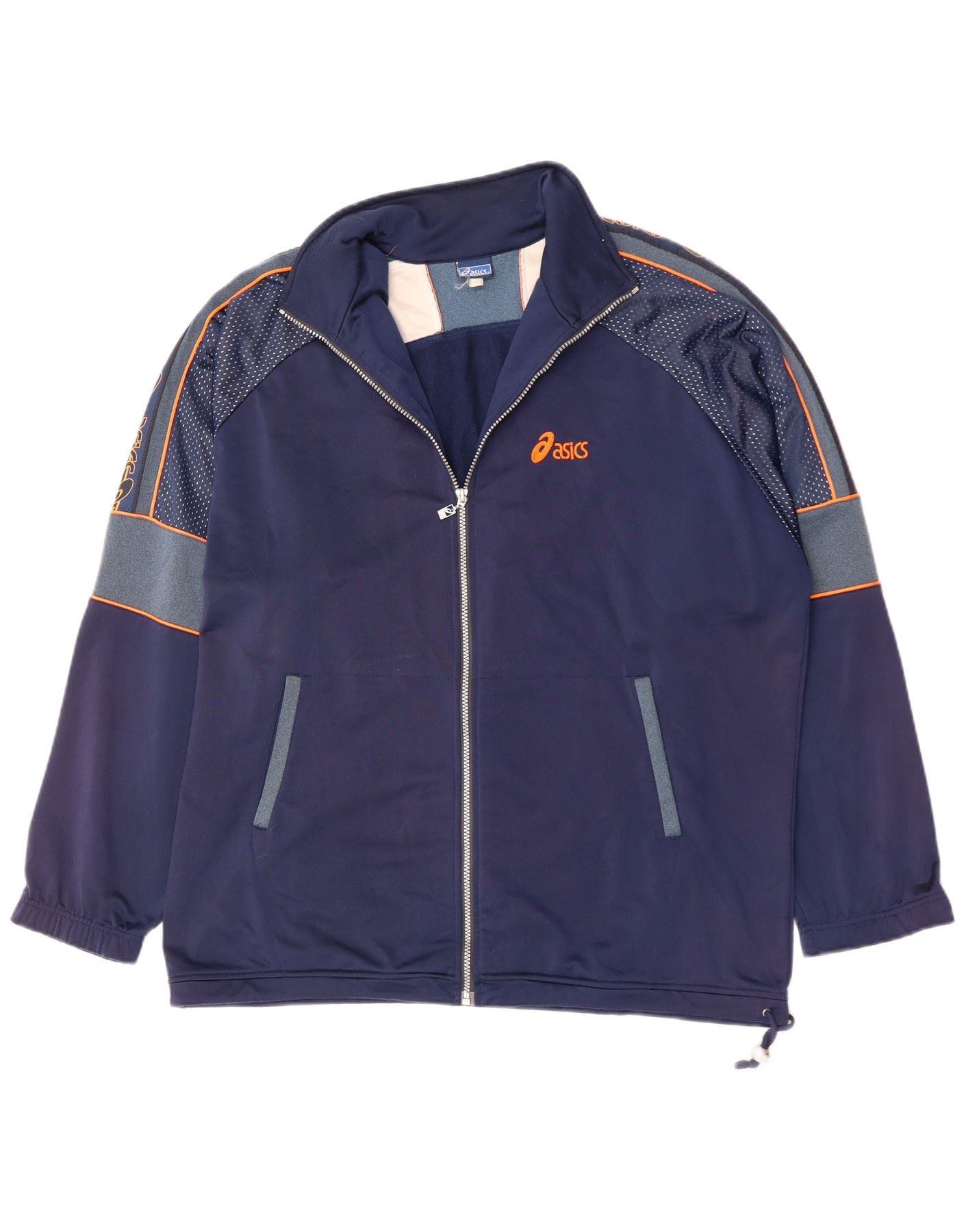 - AI Description: This Asics mens tracksuit top jacket is crafted from a navy blue blended fabric, offering a smooth finish. It features a collared neckline and a full zip closure for versatile wear. Long sleeves and a regular fit ensure comfort and ease of movement. Geometric patterns adorn the shoulders and sleeves, adding a dynamic graphic detail. The front includes practical pockets and an orange Asics logo accent. This sports jacket is ideal for active pursuits.