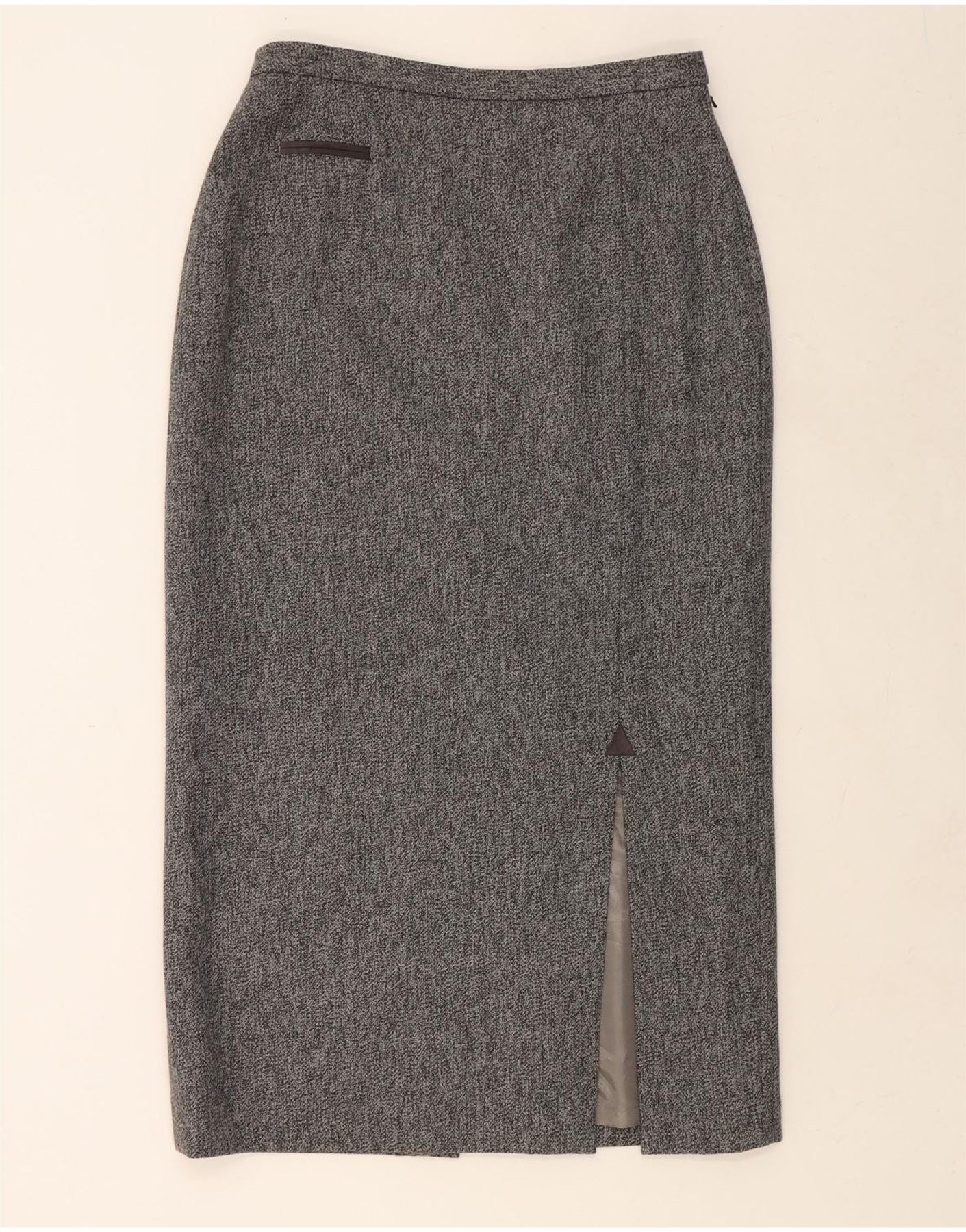 - AI Description: This classic Avoca pencil skirt is a timeless addition to any wardrobe. Crafted from grey tweed, this UK size 16 skirt features a high waist and a comfortable regular fit. The pull-on closure ensures ease of wear, while the full lining provides a smooth silhouette. Perfect for both professional and casual occasions. This pre-owned skirt is in excellent condition.