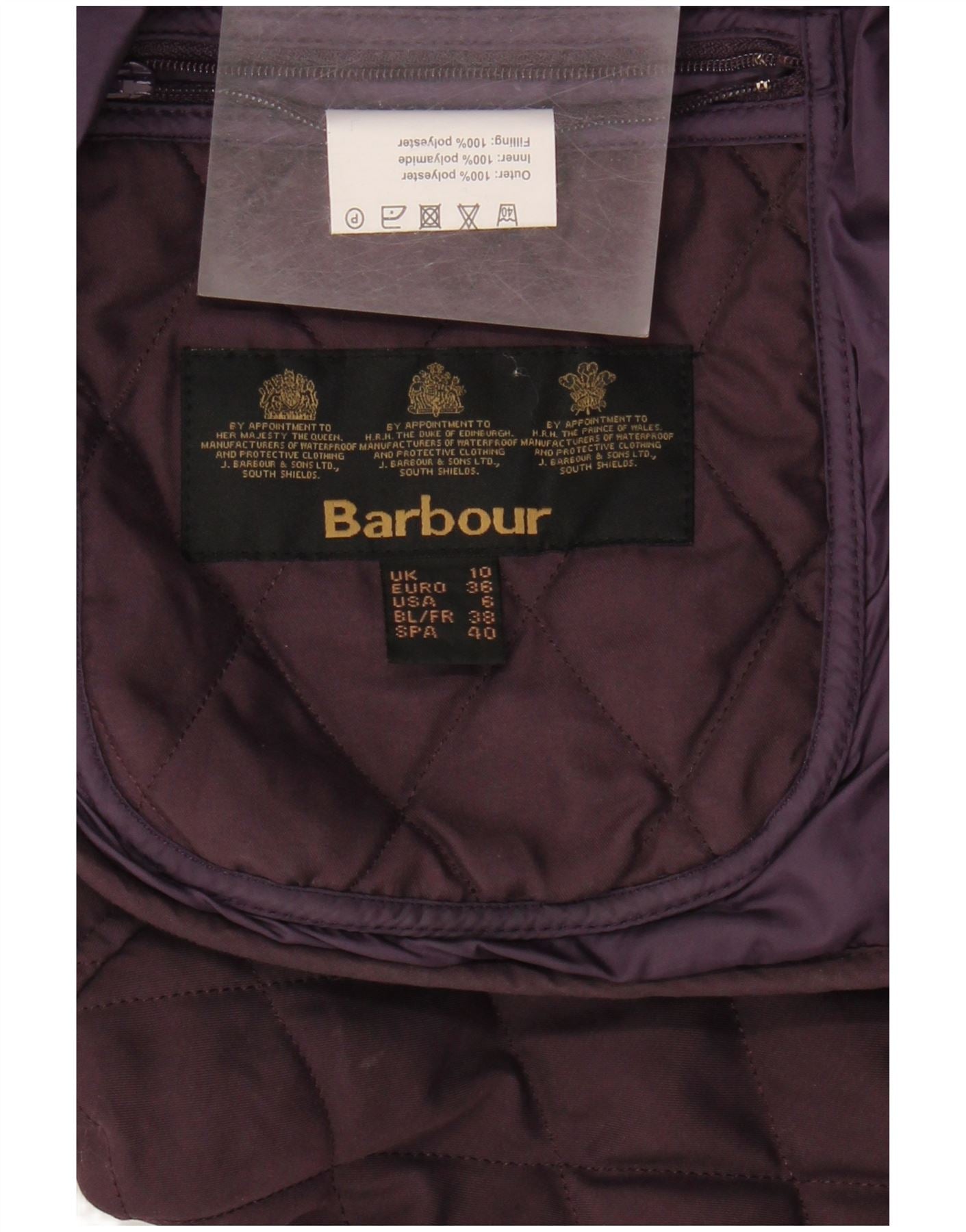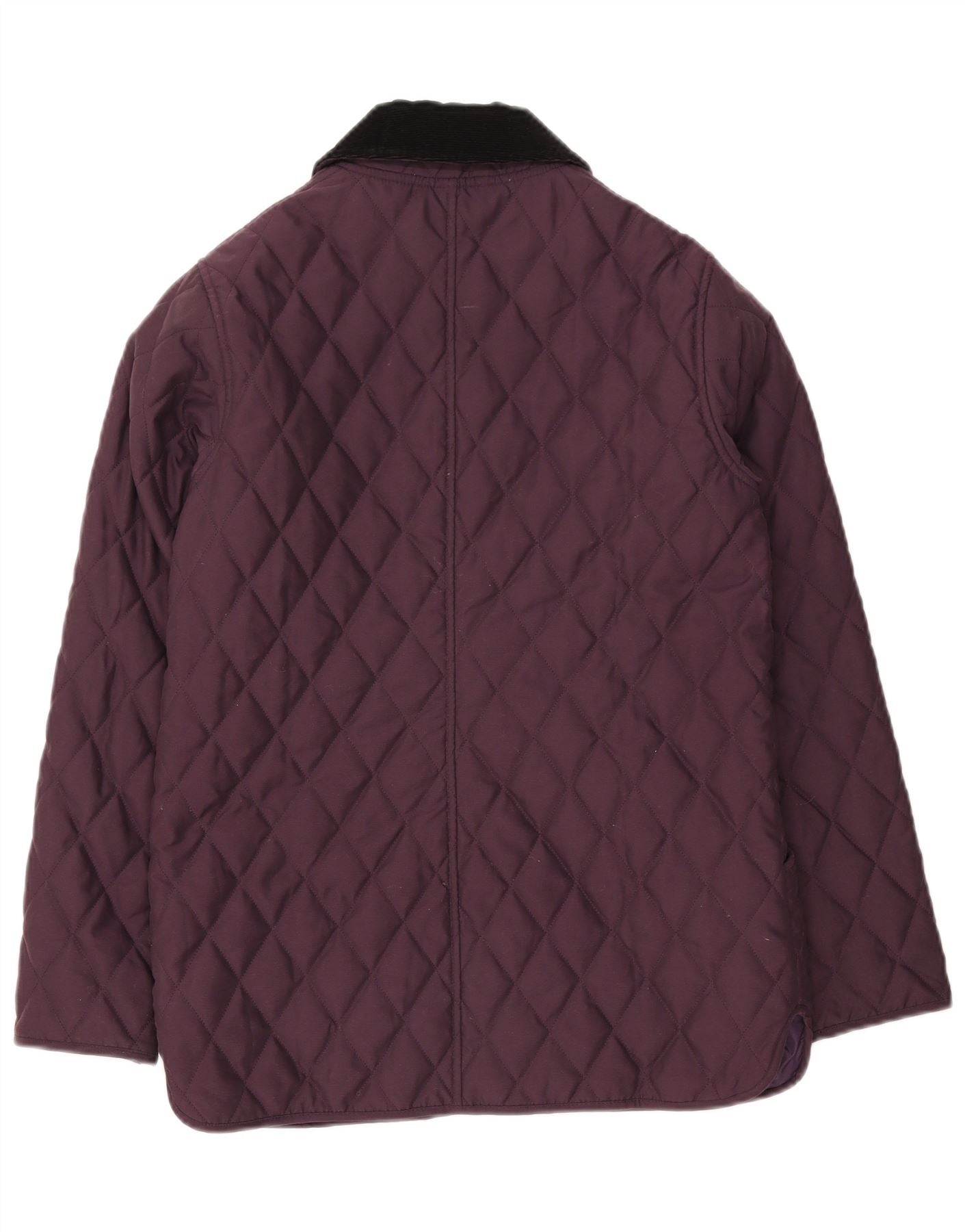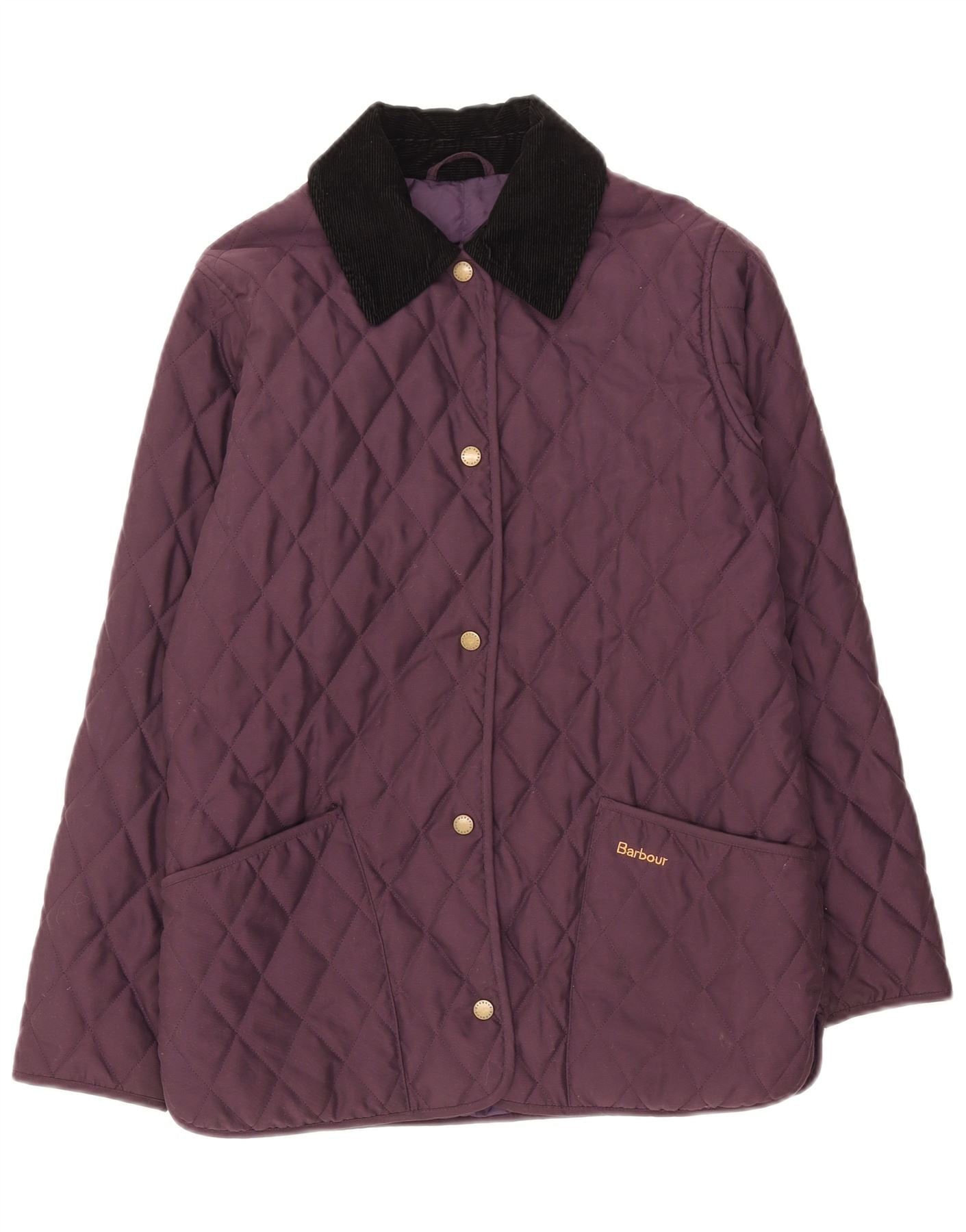 - AI Description: This Barbour womens quilted jacket is crafted from purple polyester with a distinctive quilted finish. It features a classic collared neckline, accented with corduroy for a refined touch. Long sleeves and a regular fit ensure comfortable wear. The button closure provides a neat front. Practical pockets add functionality. Its quilted design offers warmth and a timeless aesthetic, perfect for everyday British style.
