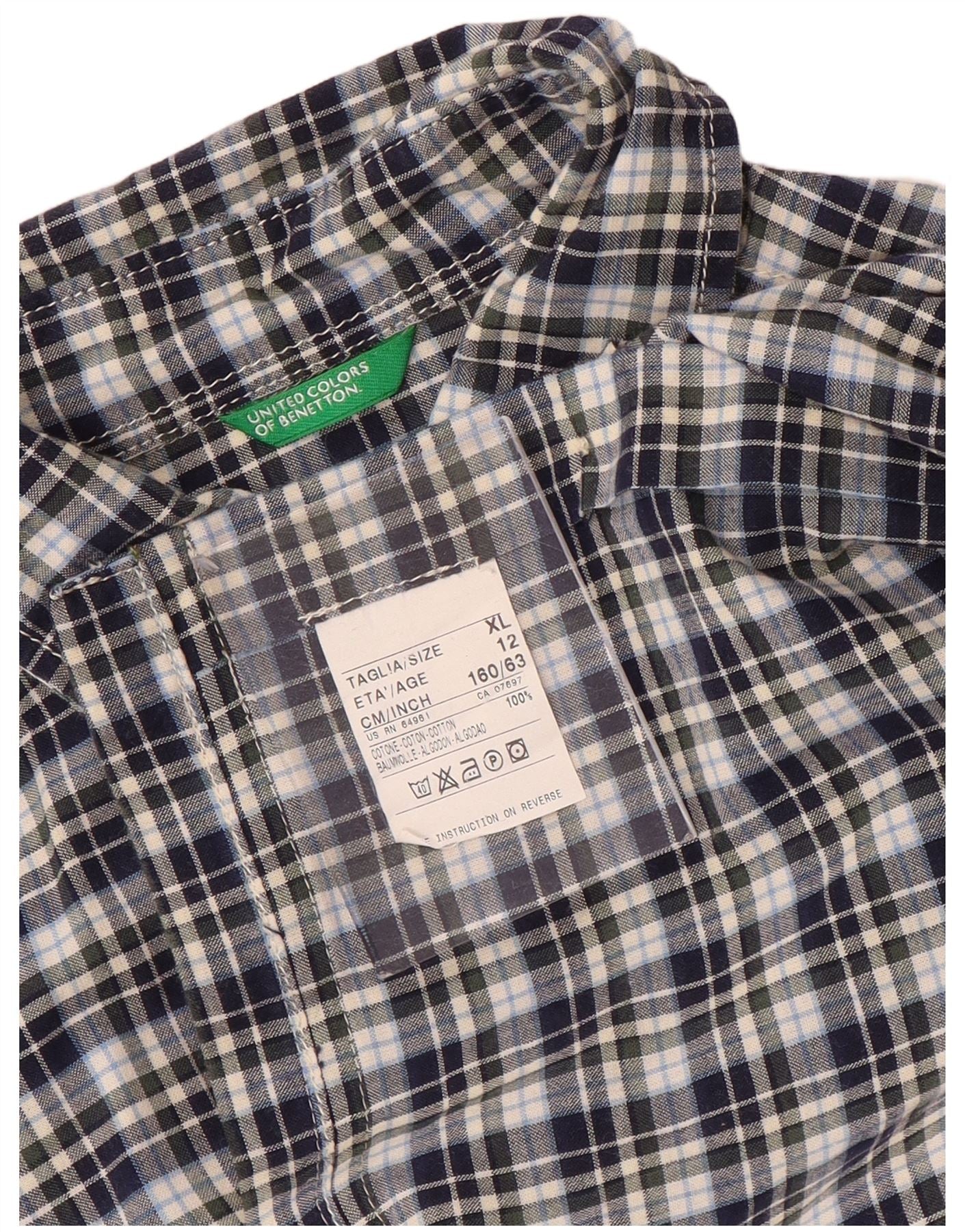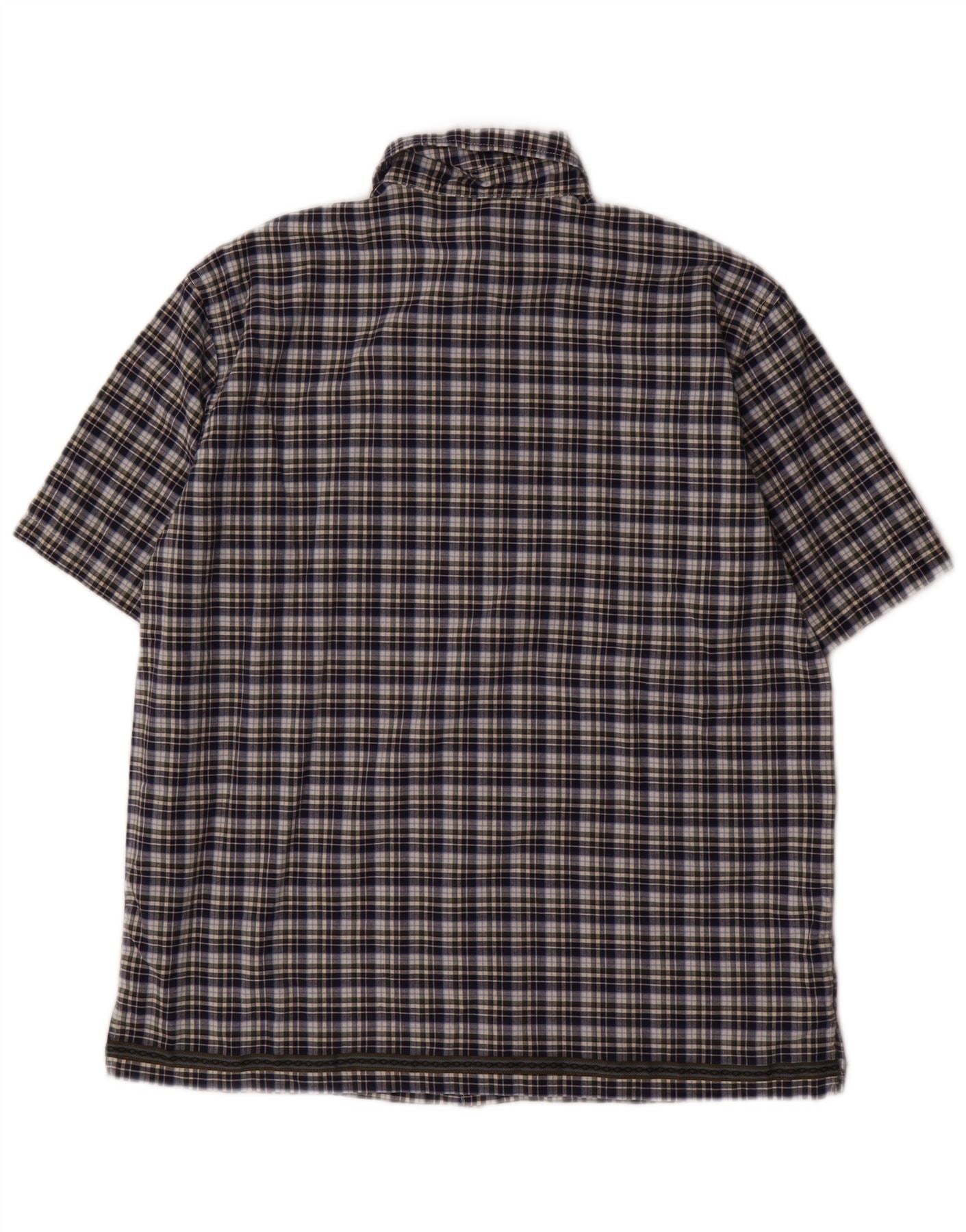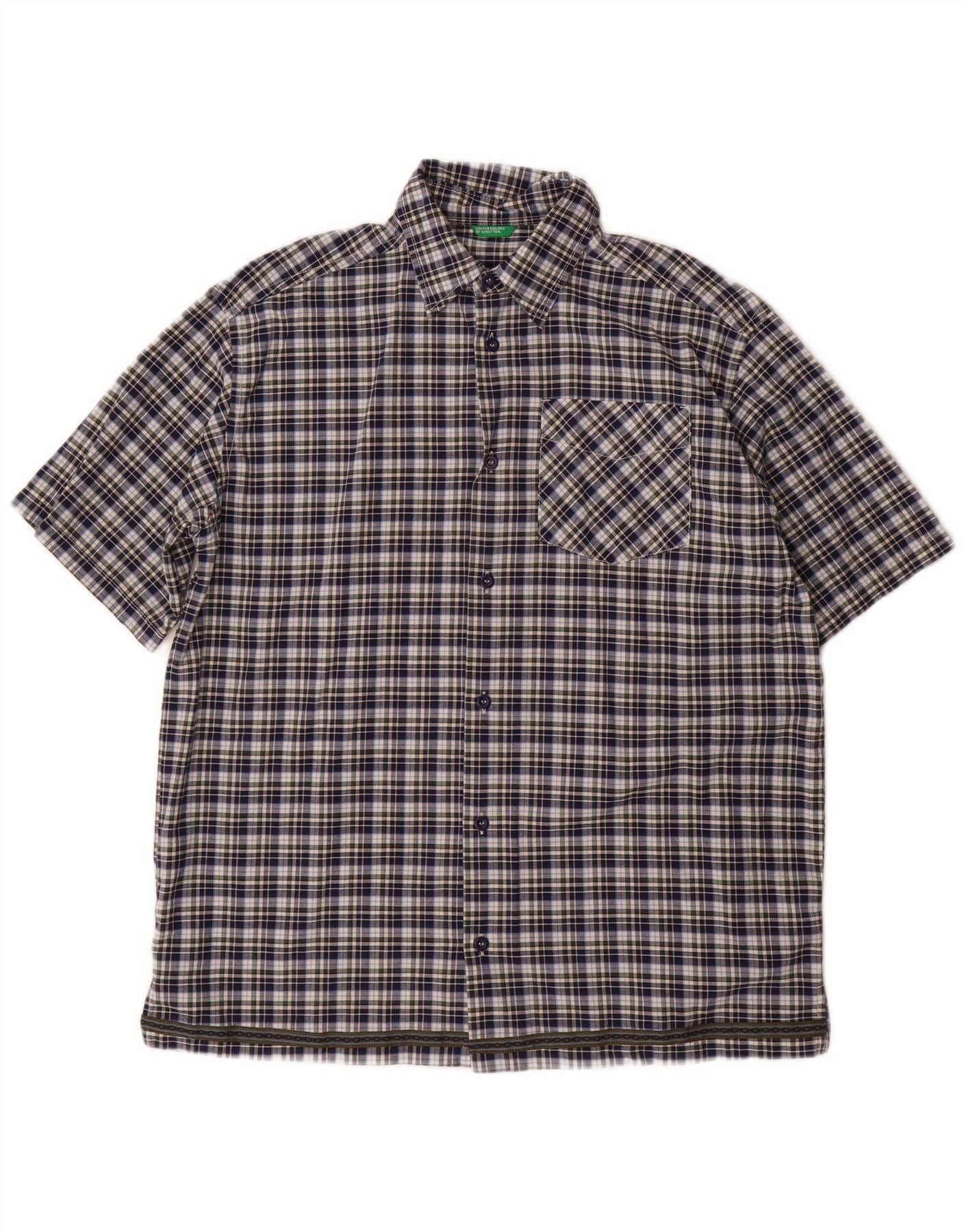 BENETTON Boys Short Sleeve Shirt 11-12 Years XL Navy Blue Check Cotton