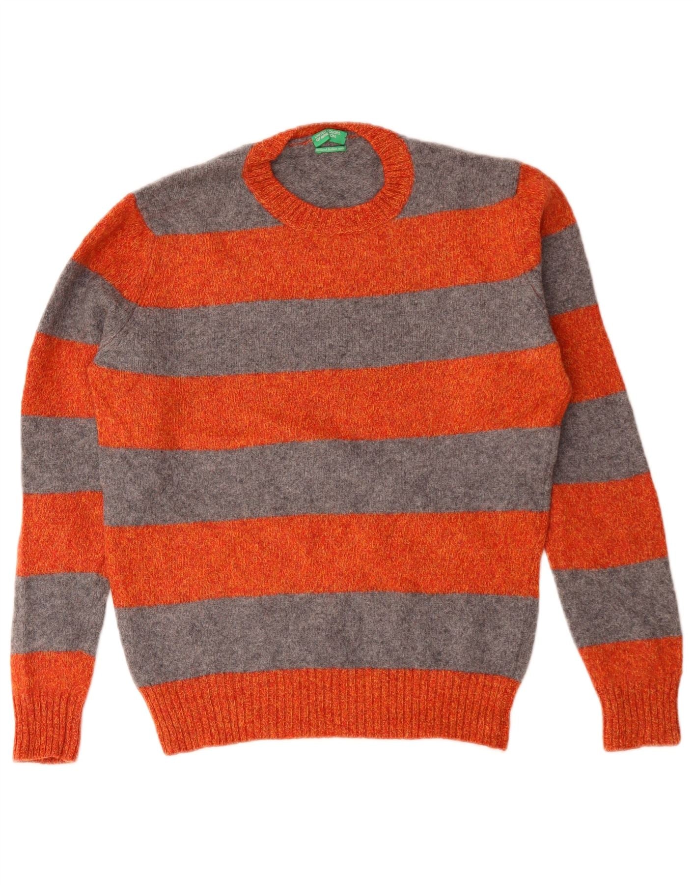 BENETTON Mens Crew Neck Jumper Sweater Small Orange Striped Virgin Wool
