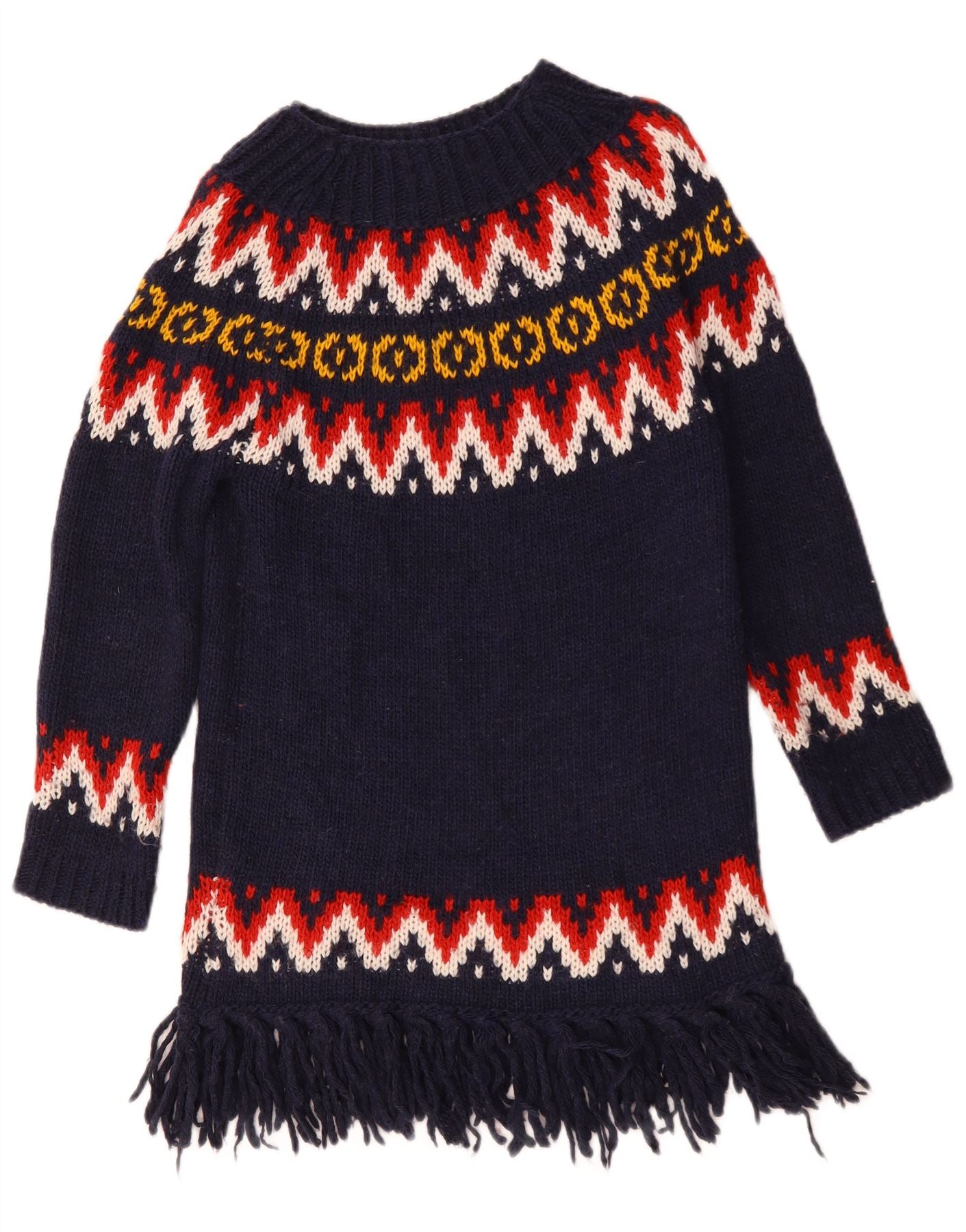 - AI Description: This United Colors Of Benetton womens sweater is crafted from a comfortable navy blue knit. It features a striking Fair Isle pattern in red, white, and yellow across the chest and sleeves. The round neck and long sleeves offer a traditional silhouette. A regular fit ensures comfortable wear. The hem is finished with a playful fringe detail. This pullover style combines warmth with a distinctive, classic aesthetic, perfect for a cosy look.
