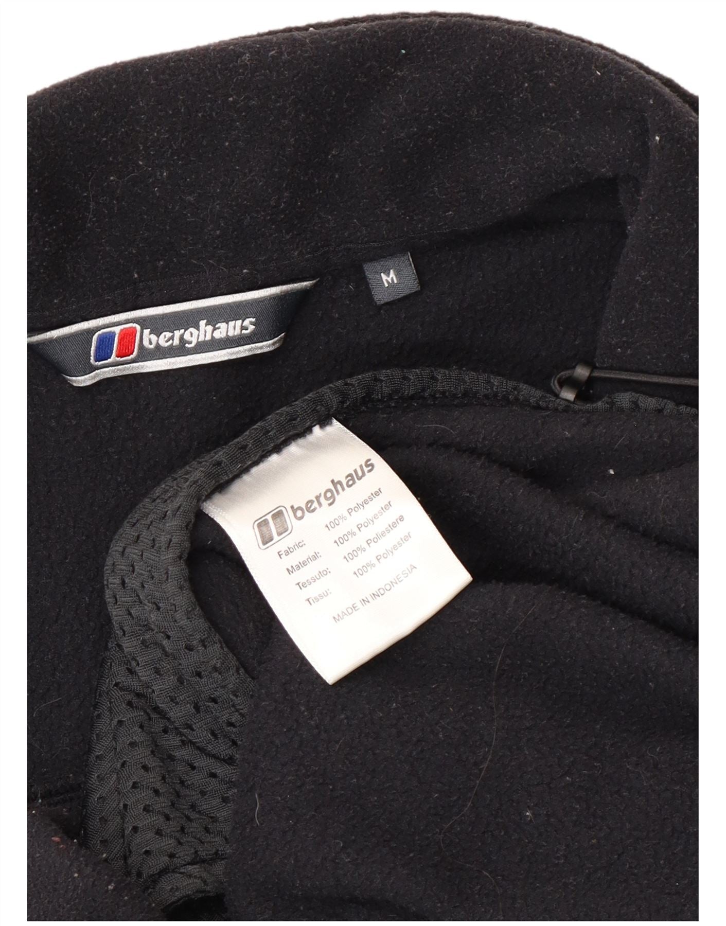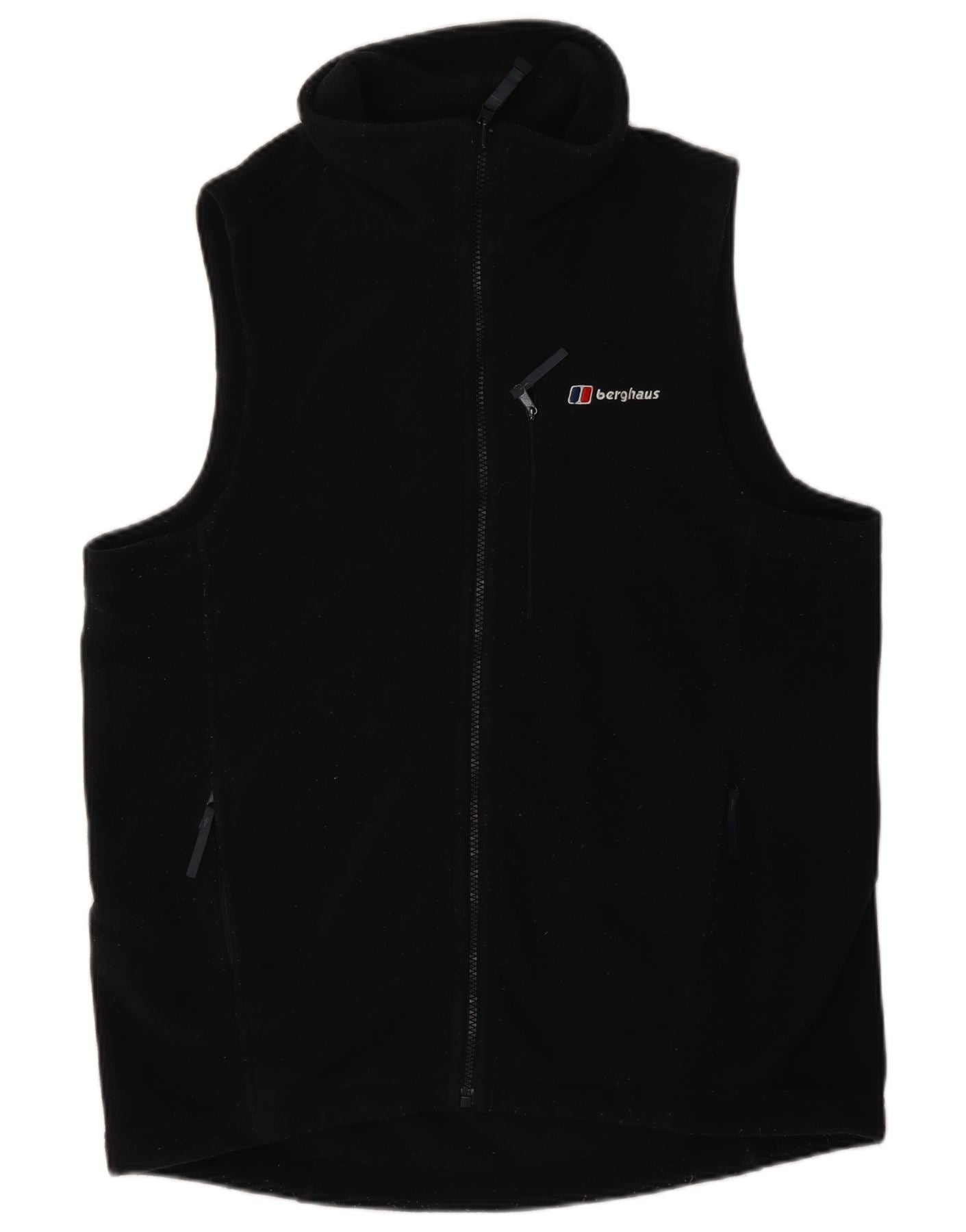 - AI Description: This Berghaus mens sleeveless zip hoodie sweater is crafted from 100 percent polyester fleece. It features a high neck and a full zip closure. The regular fit ensures comfort and ease of movement. Practical zipped pockets offer secure storage. A prominent logo accent adds a signature touch to this black sports style garment.