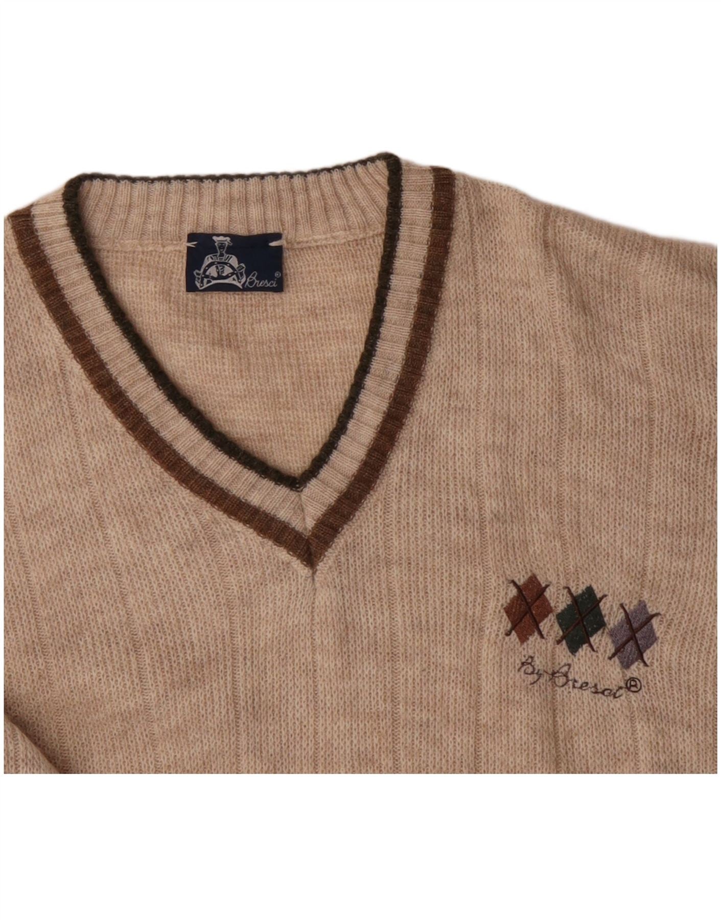 BRESCI Mens V-Neck Jumper Sweater XL Beige Acrylic