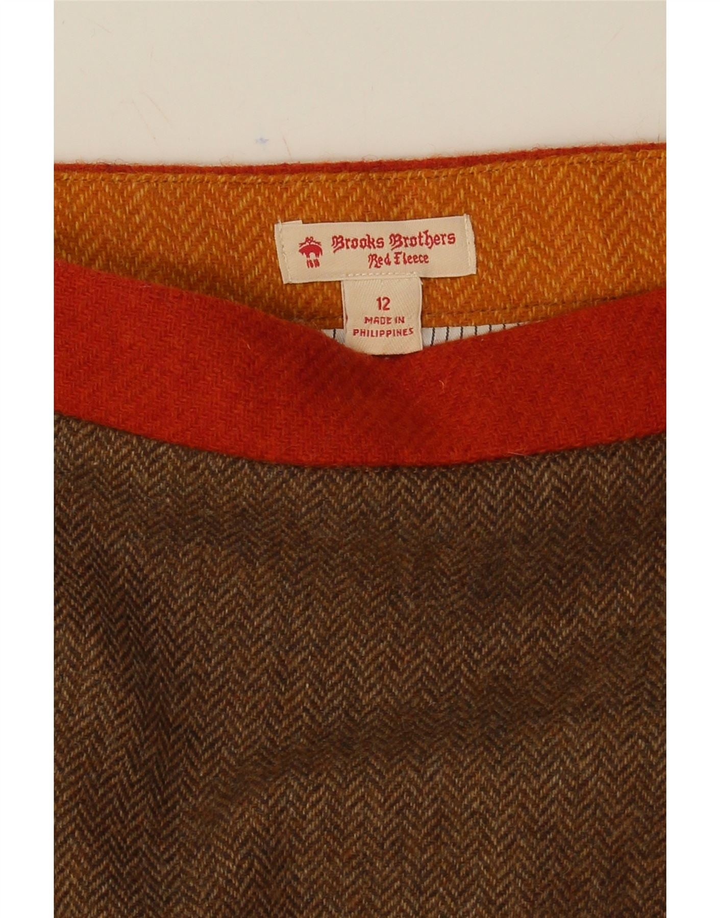 - AI Description: A stylish Brooks Brothers Red Fleece mini skirt for women. This preppy, retro-inspired skirt features a classic brown herringbone woven fabric. Designed with a regular fit, it offers a smart look suitable for various occasions. Labelled size 12. Presents in excellent pre-owned condition, with minor pilling noted around the waistband, as detailed in the condition report. Made in the Philippines.