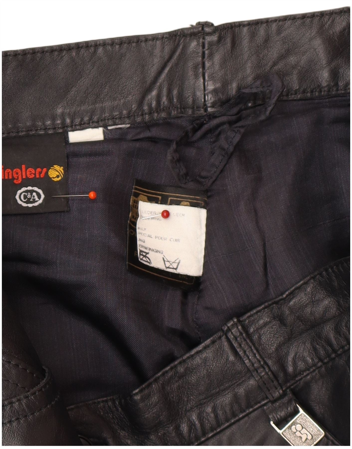 - AI Description: This C&A mens leather biker trousers are crafted from smooth black leather, offering a sleek, robust finish. They feature a regular fit and a button closure for a classic silhouette. Zipped pockets add practical detail and a modern edge. The biker style is enhanced by subtle design elements. A discreet logo provides a signature touch.