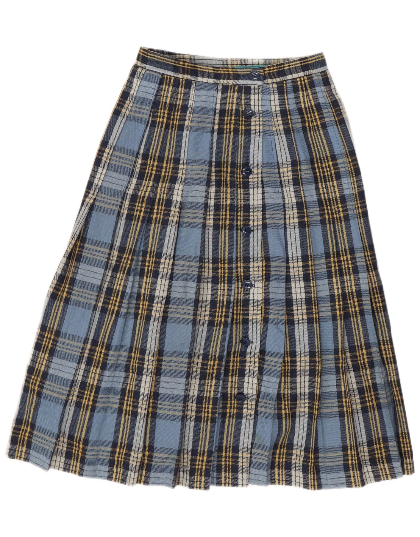 - AI Description: This Cacharel womens pleated skirt is crafted from a woven fabric, featuring a classic plaid pattern. Its multicoloured design blends shades of blue, navy, and yellow. The skirt features elegant pleats throughout, creating a graceful, flowing silhouette. A full button-front closure adds a traditional touch and ensures a regular fit. This classic style offers timeless appeal and versatile wear.