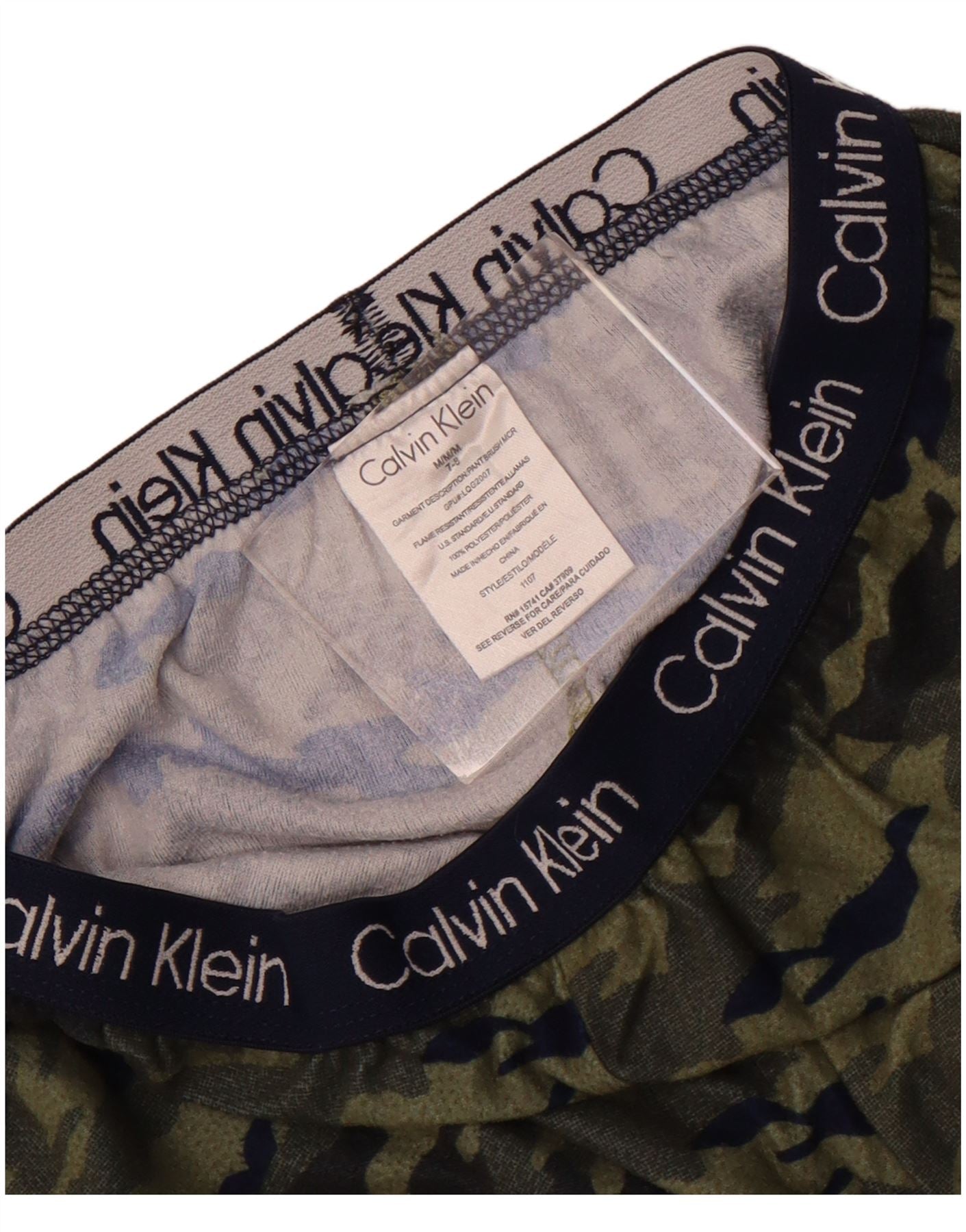 - AI Description: These Calvin Klein boys pyjama bottoms are crafted from lightweight microfibre polyester for ultimate comfort. They feature a pull-on style with an elasticated waistband, ensuring a regular fit. The straight leg design offers ease of movement. A distinctive camouflage pattern in green, khaki, and black covers the fabric. The iconic Calvin Klein logo is visible on the waistband, adding a signature touch.