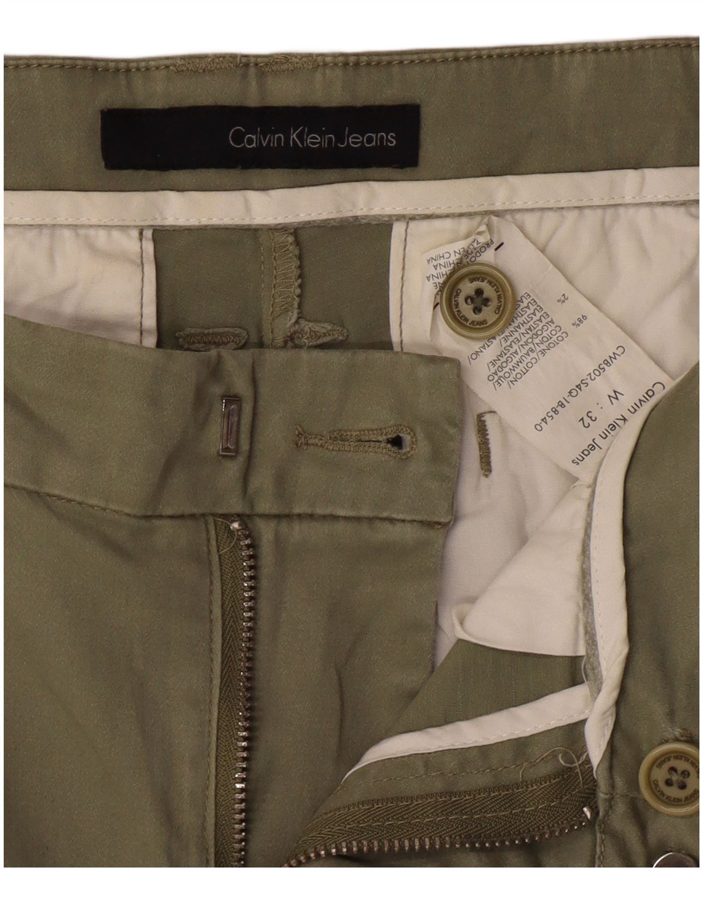 - AI Description: These Calvin Klein Jeans men's chino trousers are crafted from a woven cotton blend for a smooth, comfortable feel. The regular fit and classic style offer timeless appeal. They feature a zip closure and practical pockets. The tapered leg shape provides a modern silhouette. These green chinos are ideal for smart casual wear.