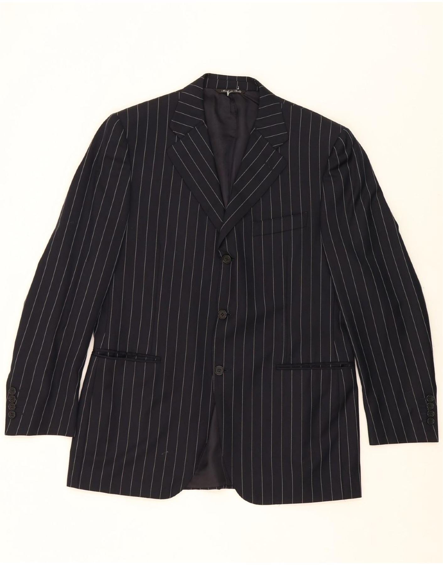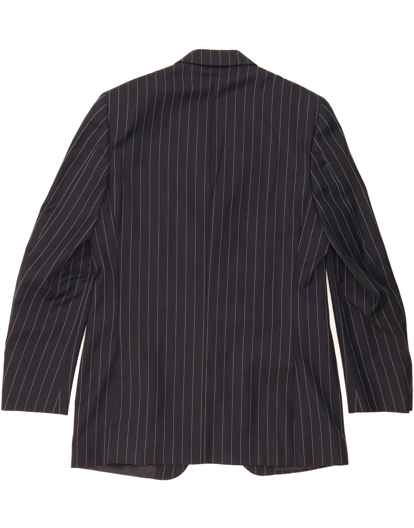 - AI Description: This classic, pre-owned Canali two-piece suit is crafted in Italy from 100% pure wool with a Bemberg lining. The black, pinstripe suit features a regular fit, two-button closure, and long sleeves. Accented with buttons, the woven fabric provides a sophisticated silhouette with subtle shoulder pads. In excellent condition, with minor visible wear overall. Label size 48. Dry clean only.