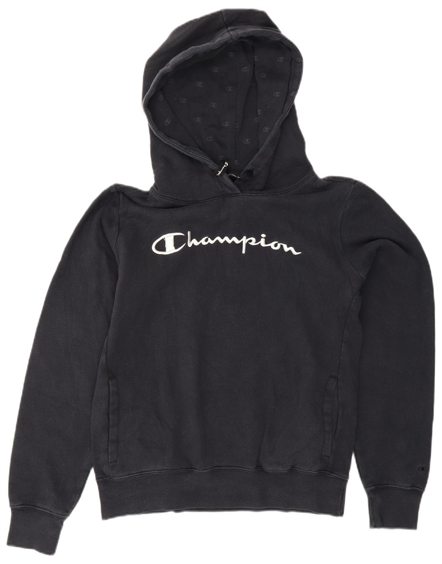 CHAMPION Womens Graphic Hoodie Jumper UK 12 Medium Navy Blue Cotton