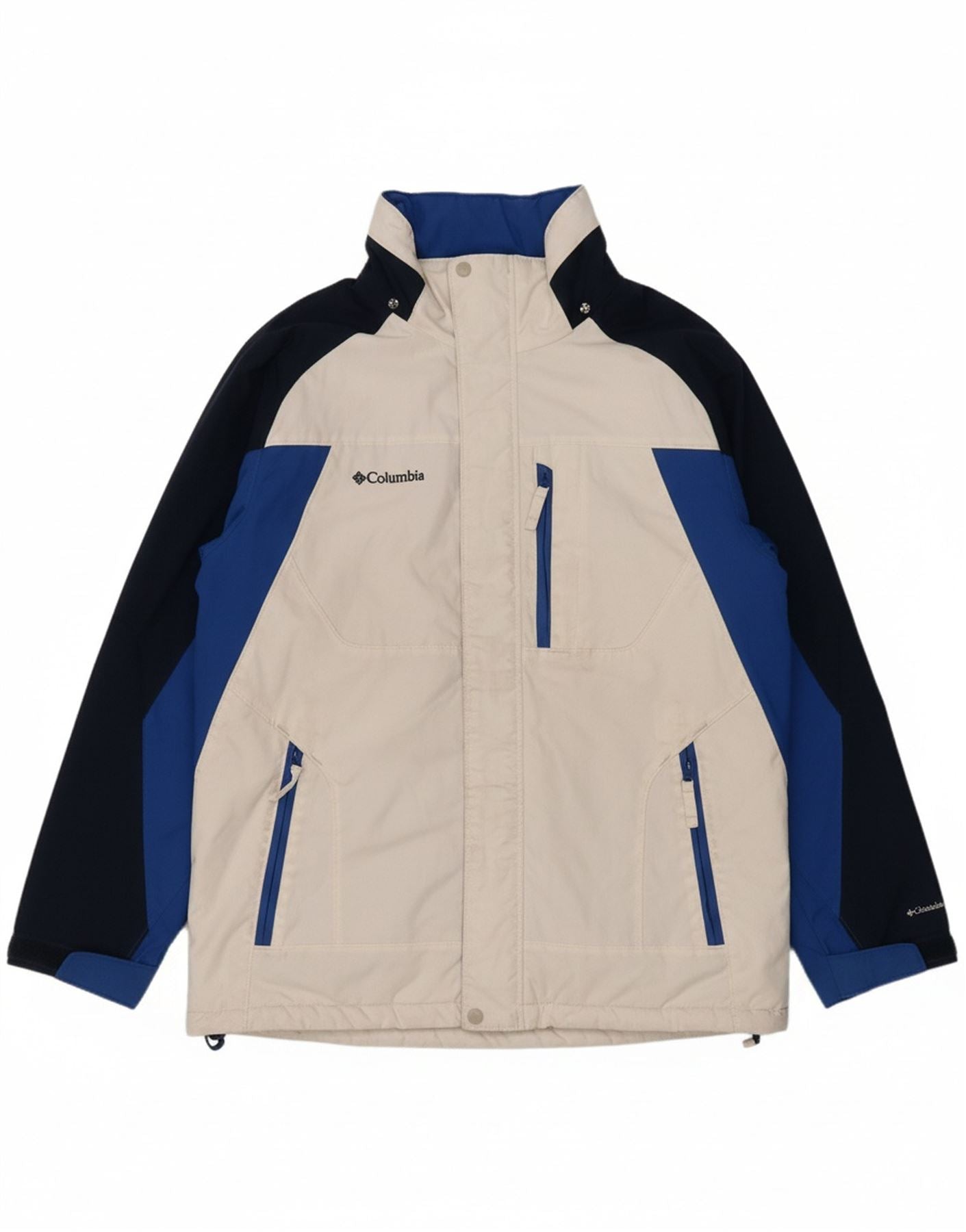 - AI Description: This Columbia mens Padded Jacket is crafted from durable nylon, offering a smooth, weather-resistant finish. It features a striking colourblock pattern in white, blue, and navy blue. The collared neckline and full zip closure provide excellent protection. Long sleeves and a regular fit ensure comfort and mobility. Practical pockets and adjustable features complete this functional, stylish piece.