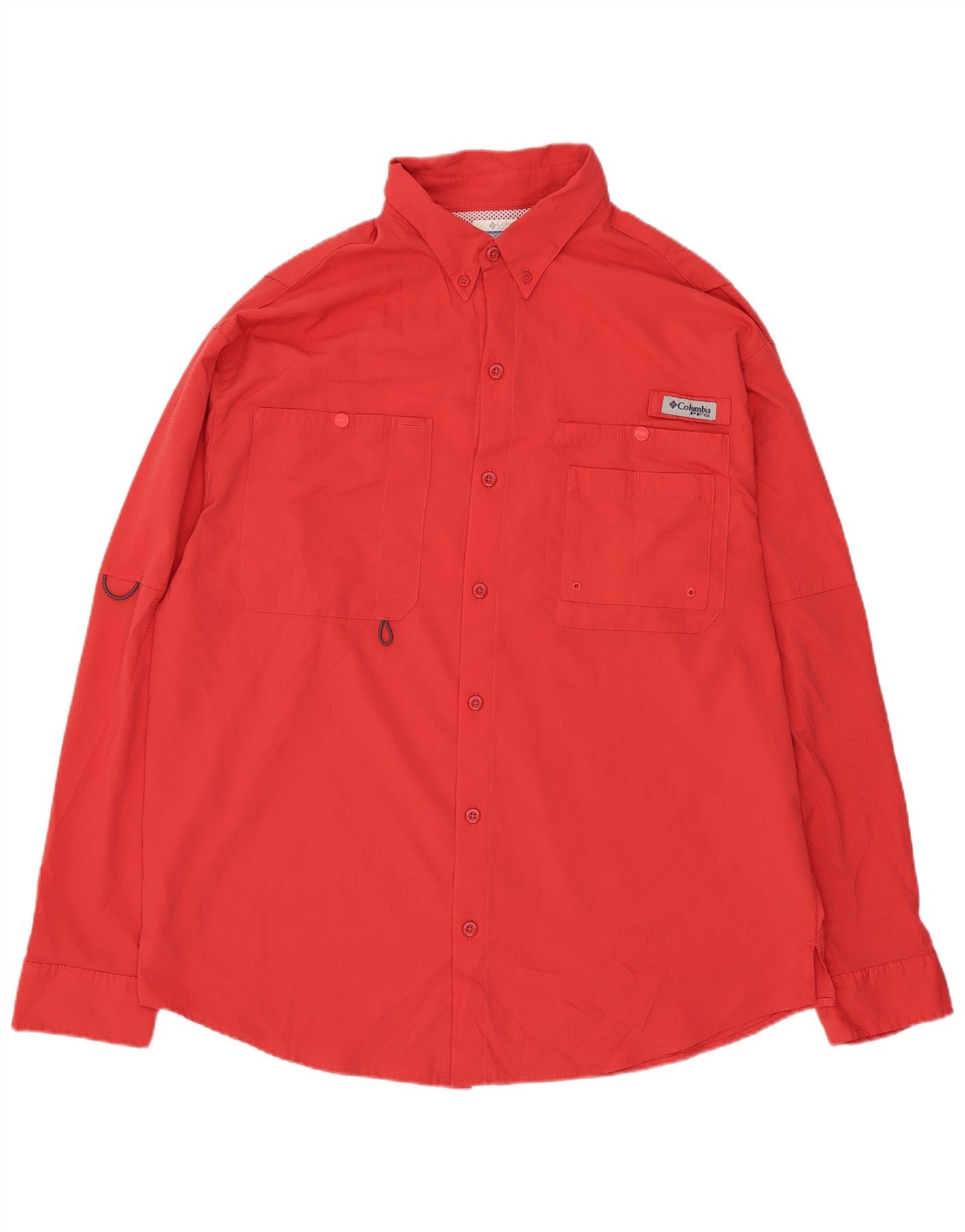 - AI Description: This Columbia mens shirt is a vibrant red, crafted from a lightweight, breathable woven fabric. It features a classic collared neckline and long sleeves with buttoned cuffs. The full button-up front ensures a secure closure. Two chest pockets offer practical utility. A subtle Columbia logo accents the design. The regular fit provides comfort and ease of movement, ideal for sports like fishing.