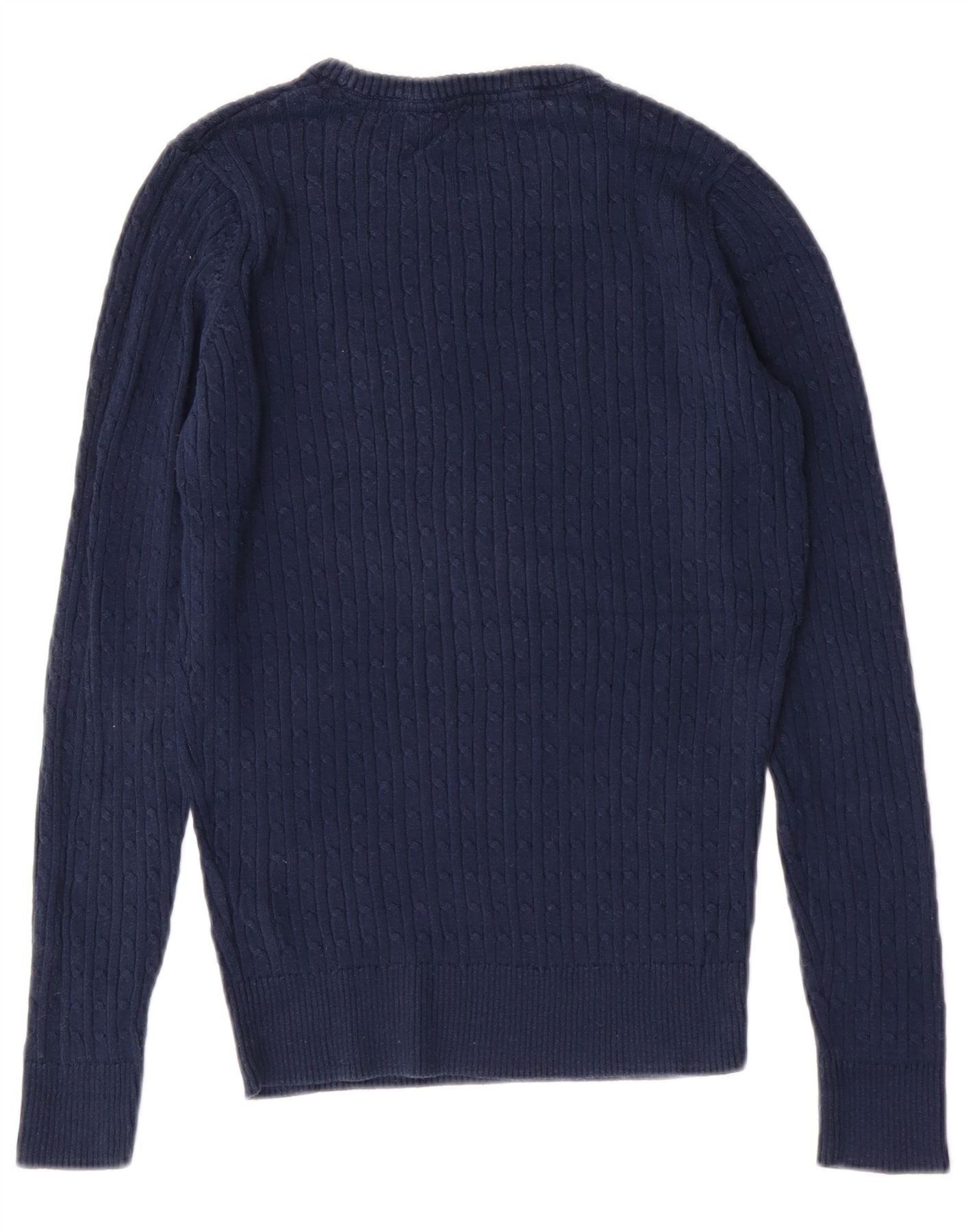 - AI Description: This Crew Clothing women's jumper sweater is crafted from 100% cotton knit with a classic cable texture. It features a comfortable crew neckline and long sleeves. The pullover design offers a regular fit for easy wear. A small embroidered logo accent adds a subtle branded detail. This navy blue sweater is a timeless addition to any wardrobe.