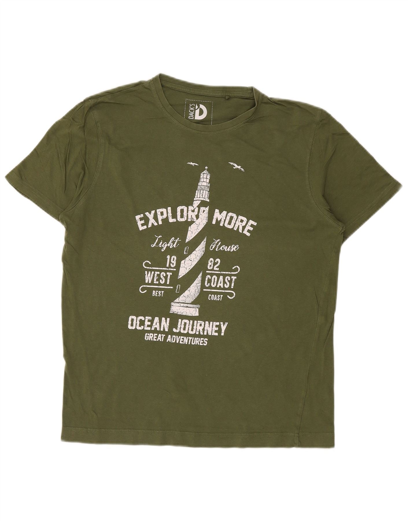 - AI Description: This Dack's men's graphic T-shirt is crafted from soft green 100 percent cotton jersey. It features a classic round neck and short sleeves for everyday comfort. The regular fit ensures a relaxed silhouette. A prominent nautical illustration with 'EXPLORE MORE' text adorns the front, adding a distinctive touch. This pullover top offers casual style and ease of wear.