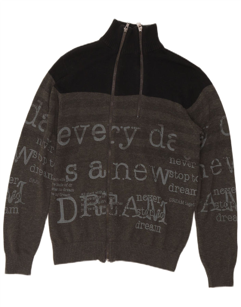 DESIGUAL Mens Graphic Cardigan Sweater Small Grey Colourblock Wool