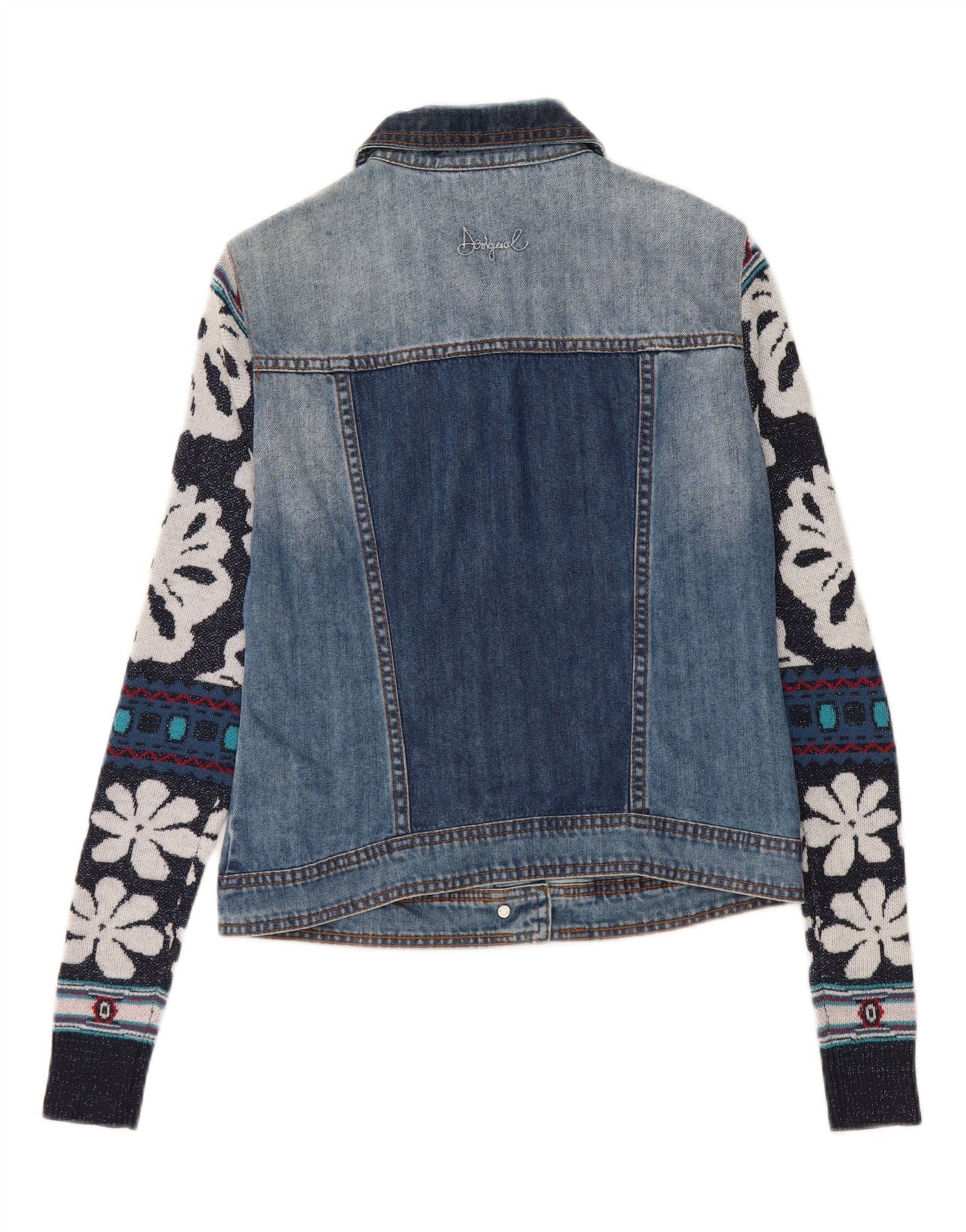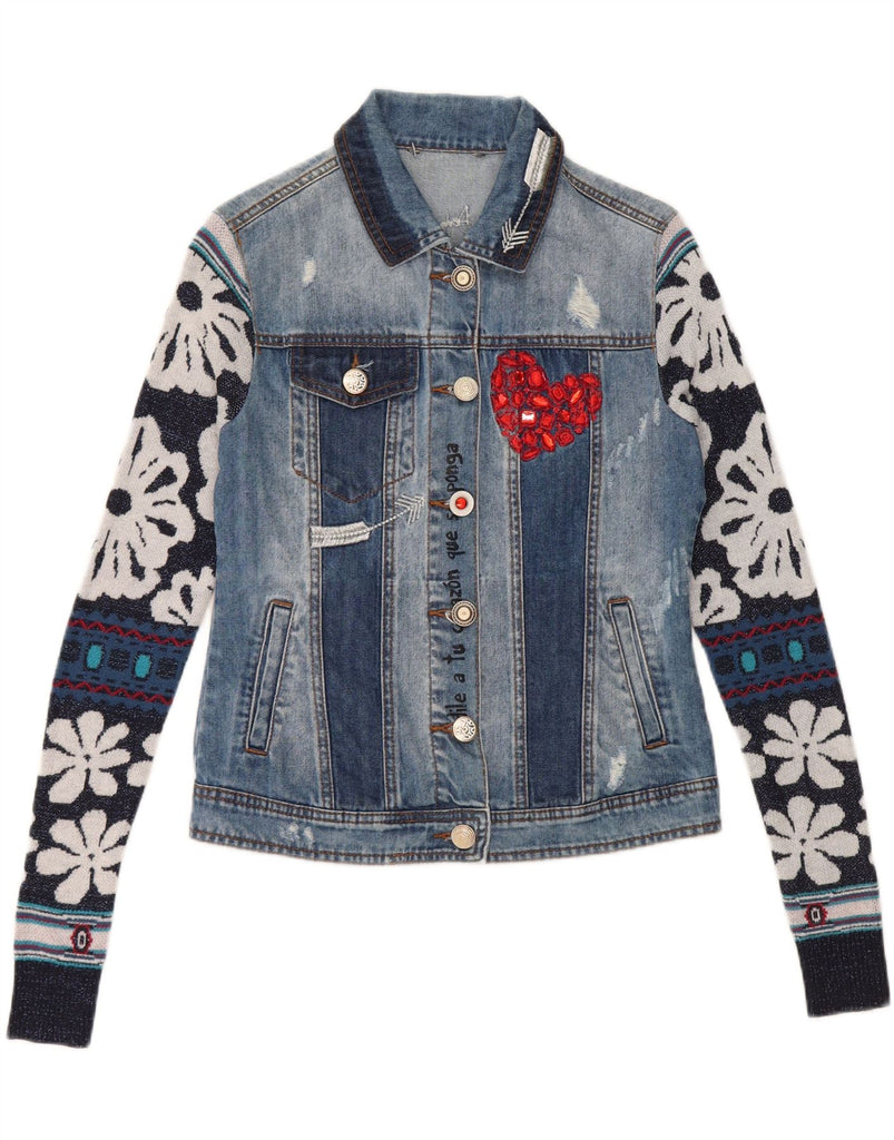 DESIGUAL Womens Crop Graphic Denim Jacket UK 10 Small Blue Floral