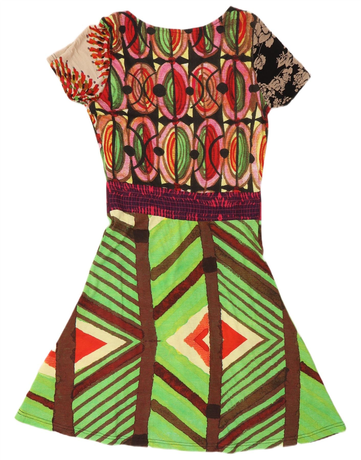 - AI Description: This Desigual womens T-shirt dress is crafted from a soft viscose and cotton blend fabric. It features a vibrant multicoloured geometric pattern throughout, showcasing a crazy, artistic flair. The dress has a classic round neckline and short sleeves. Its regular fit offers comfortable wear, with a simple pullover style. A distinctive logo detail subtly accents the design. This colourful piece combines comfort with bold, unique style.