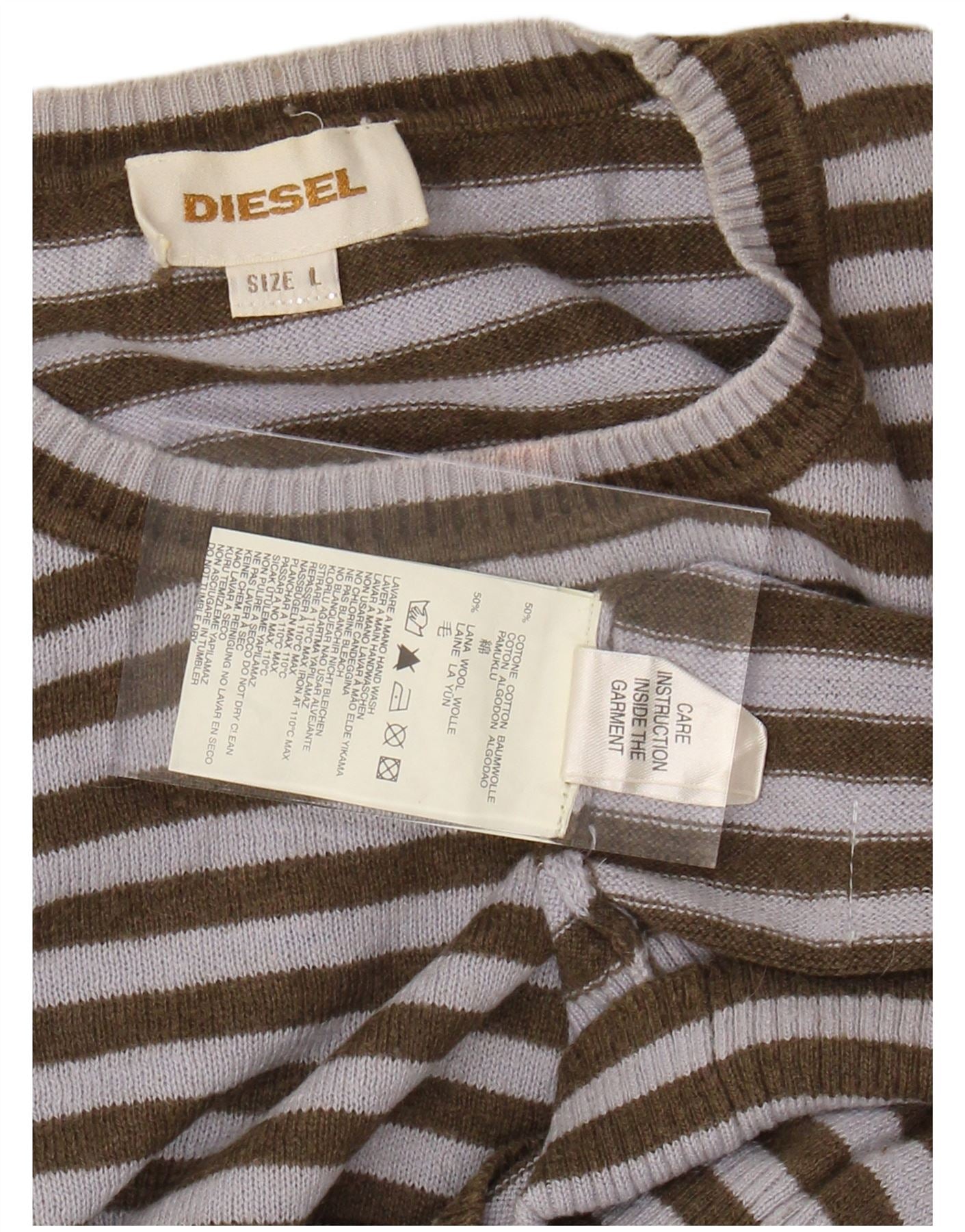Home > Women's > Depop Clothing > DIESEL Womens Crew Neck Jumper Sweater UK 16 Large Khaki Striped Cotton