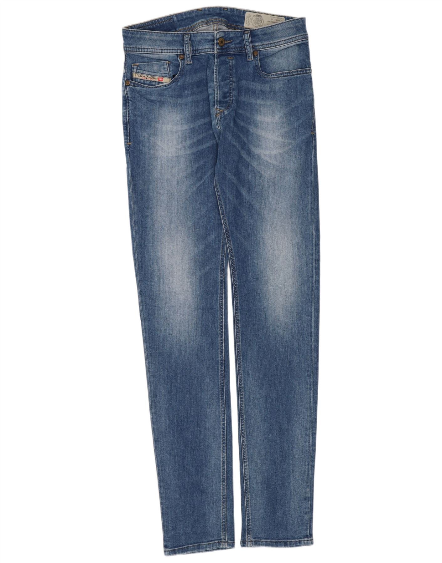 - AI Description: These Diesel womens slim jeans are crafted from blue stretch denim, offering both comfort and a sleek look. They feature a mid-rise waist and a button closure for a secure fit. The slim legs taper gracefully, creating a modern silhouette. Classic five-pocket styling and a subtle brand logo on the rear add authentic detail.