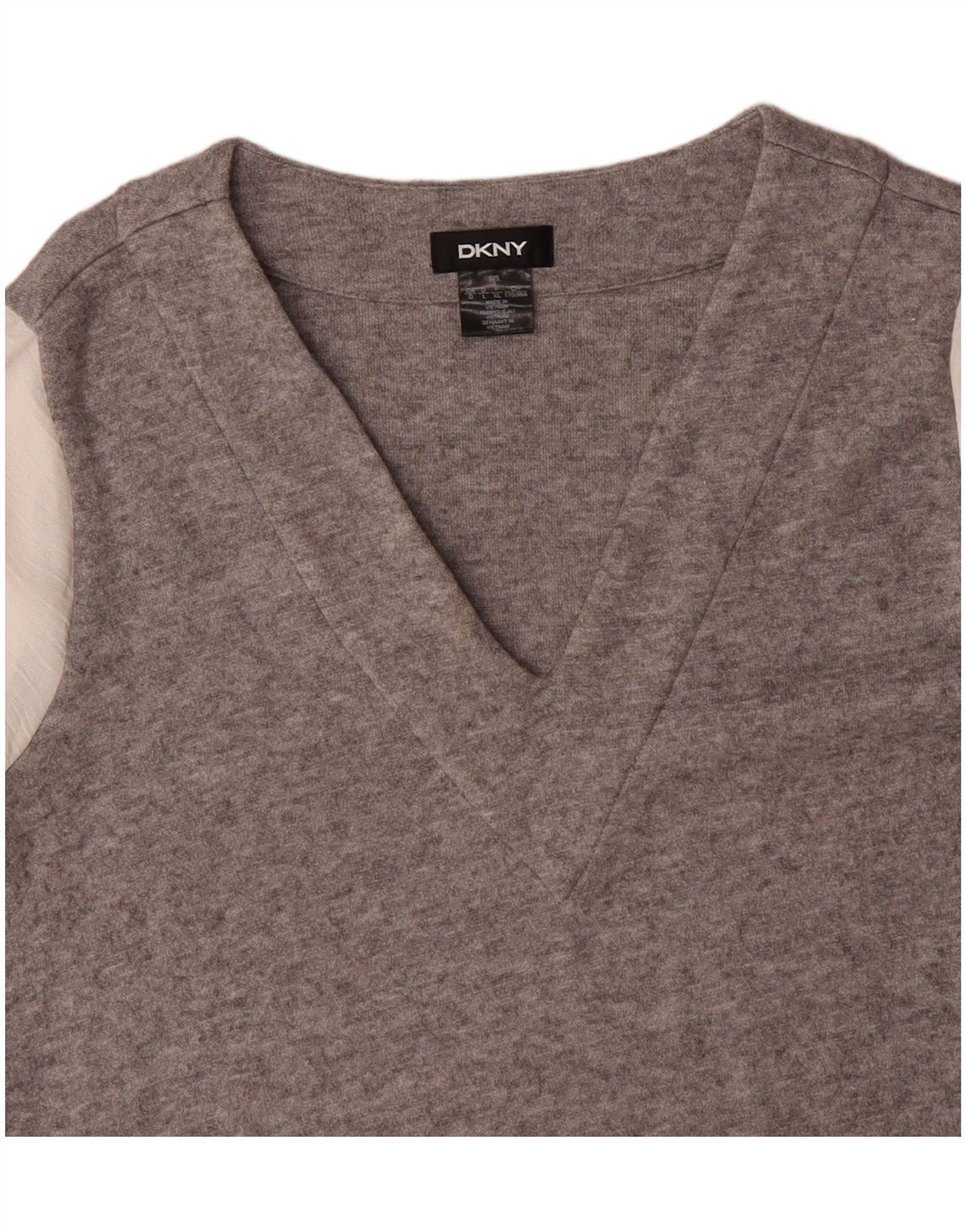 - AI Description: This Dkny womens sweater is crafted from a luxurious cashmere knit for the body, offering a soft, lightweight feel. The long sleeves are made from comfortable cotton. It features a classic V-neckline and a regular fit, ensuring comfort and a timeless silhouette. The pullover style makes it easy to wear. Its plain grey colour and knit texture provide a versatile, elegant look, perfect for everyday sophistication.