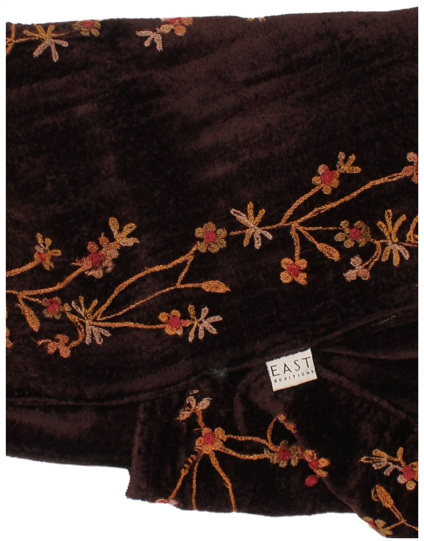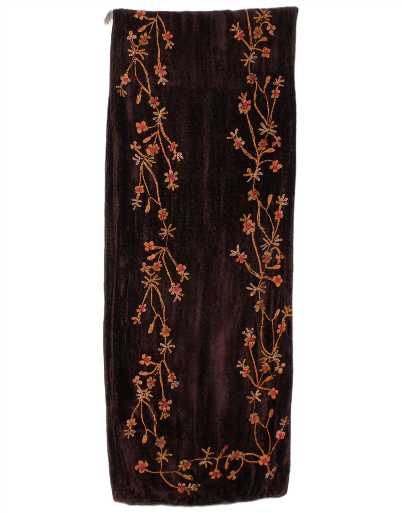 - AI Description: This East womens stole scarf is crafted from luxurious maroon velvet, offering a soft, rich texture. It features an elegant floral abstract pattern, beautifully embroidered for a refined finish. The classic fit ensures graceful draping, embodying a bohemian style. Its opulent feel and intricate detailing make it a sophisticated accessory.