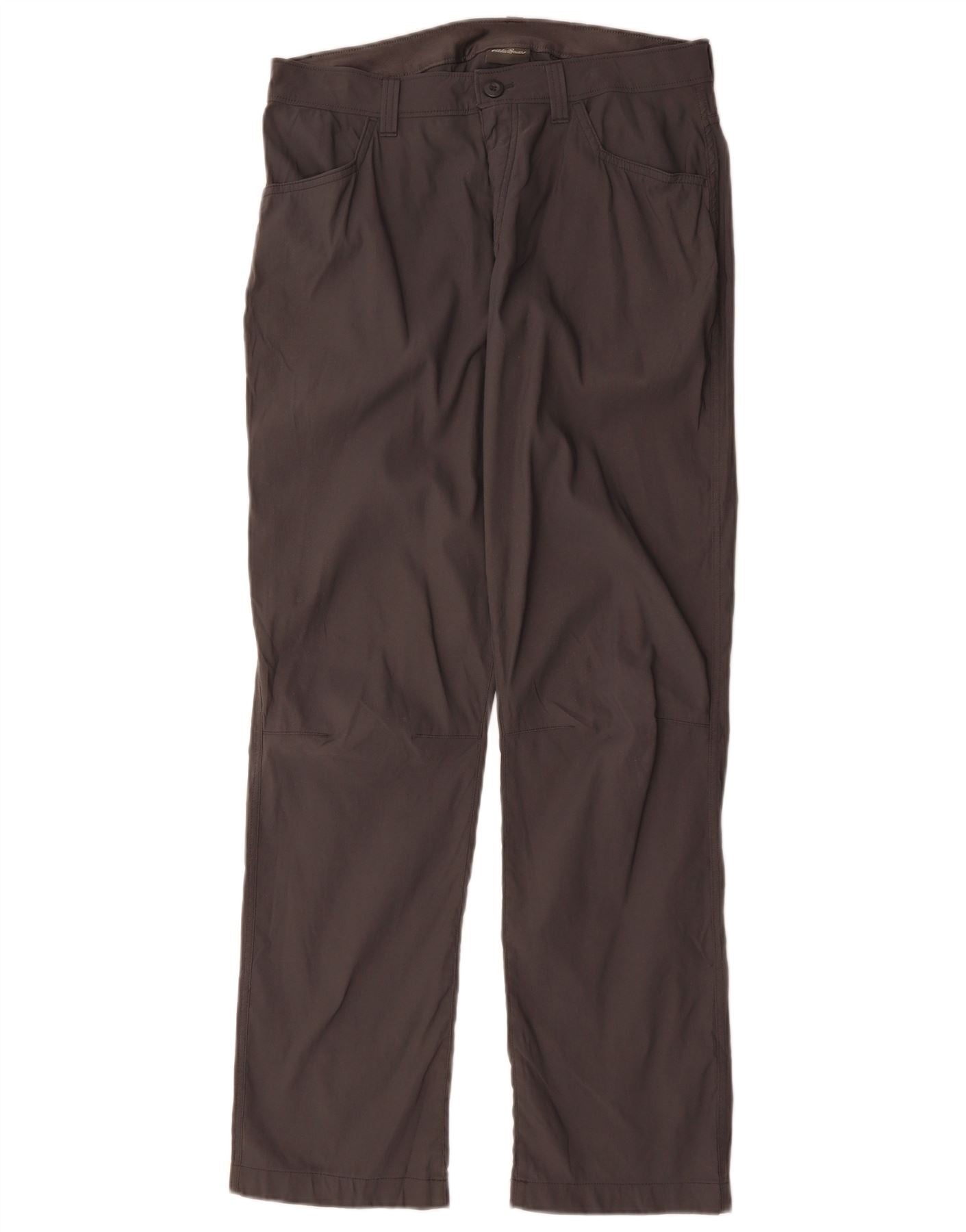 - AI Description: These Eddie Bauer mens casual trousers are crafted from lightweight, woven 100 percent nylon. The fabric offers a smooth texture and practical stretch. Presented in a versatile grey hue. They feature a regular fit with straight legs for a modern silhouette. A button closure ensures a secure and comfortable wear. Practical pockets add functionality. This design combines comfort with a clean, contemporary style.