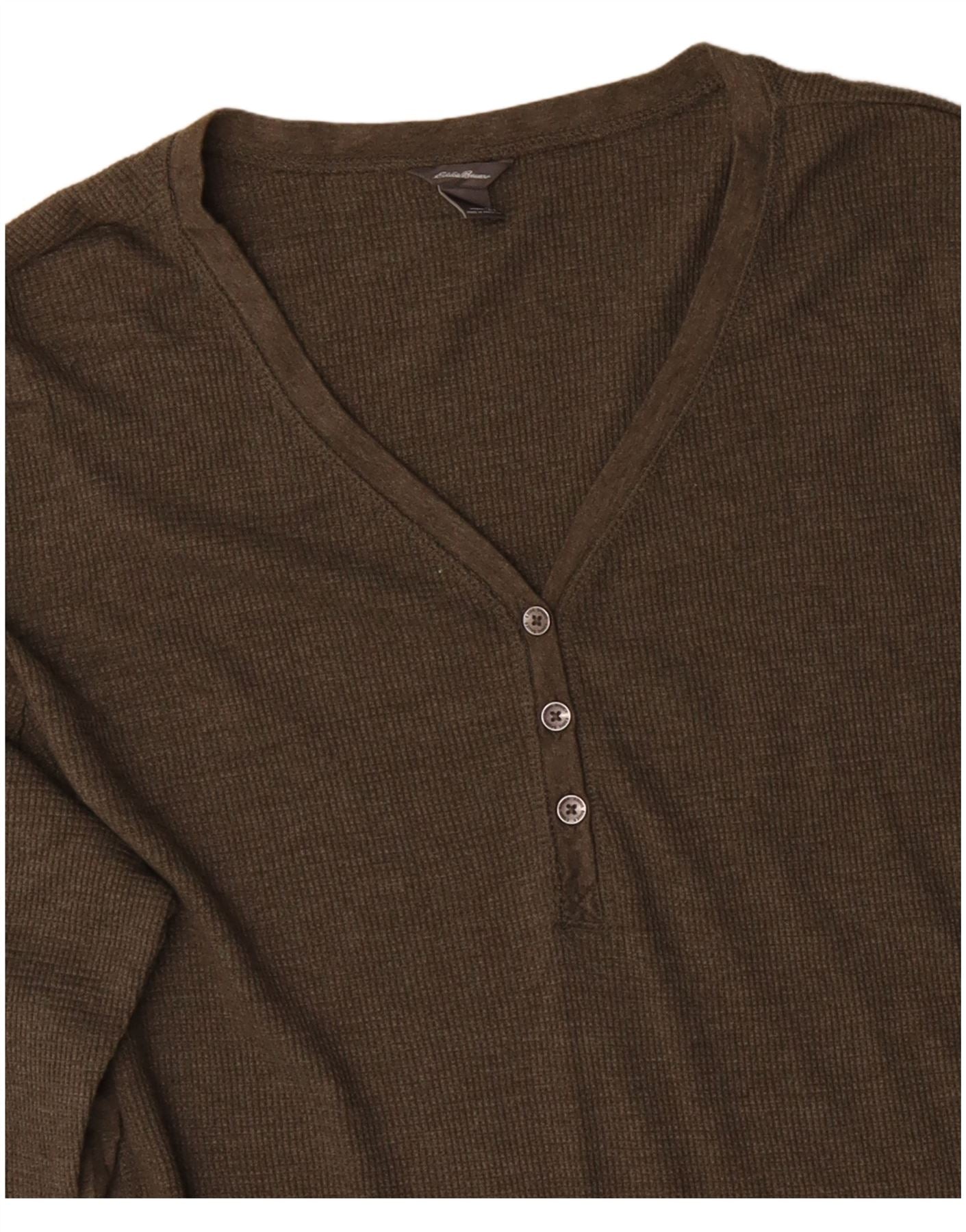 - AI Description: This Eddie Bauer womens long sleeve T-shirt top is crafted from a comfortable khaki knit fabric, featuring a subtle waffle texture. It has a classic Henley neckline with a three-button placket. Long sleeves and a regular fit ensure comfort and ease of wear. Tonal buttons blend seamlessly with the fabric. The lightweight design offers stretch for everyday versatility.