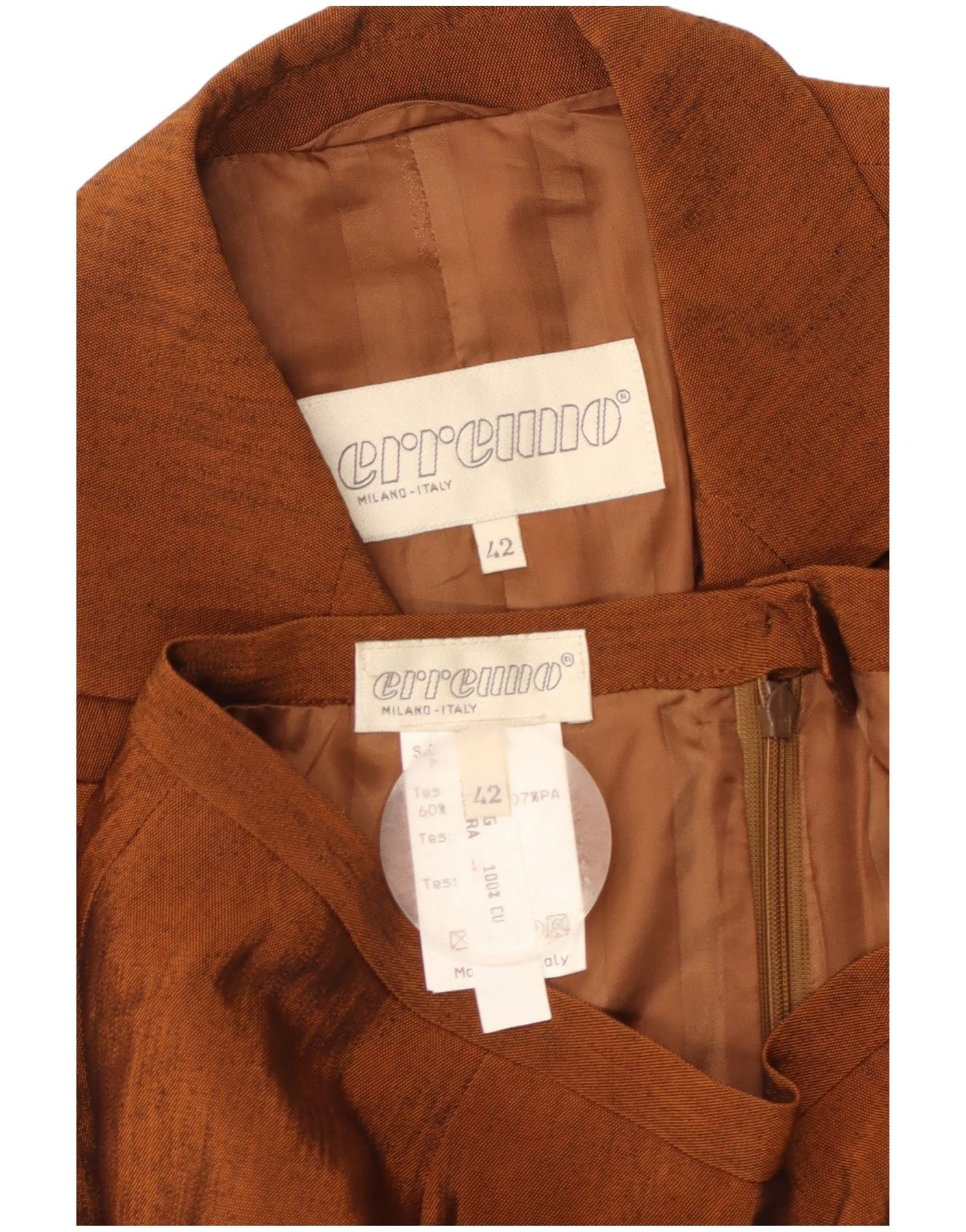 - AI Description: This Erreuno womens 2 Piece Skirt Set is crafted from a rich brown rayon blend, offering a subtle sheen and smooth texture. The collared jacket features long sleeves and a single button closure. It includes practical pockets and a full lining. The matching skirt complements the jacket with its regular fit. This classic ensemble provides a sophisticated, coordinated look for professional wear.