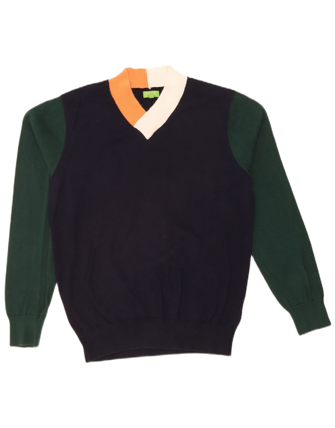 FERAUD Mens V-Neck Jumper Sweater Large Navy Blue Colourblock Cotton