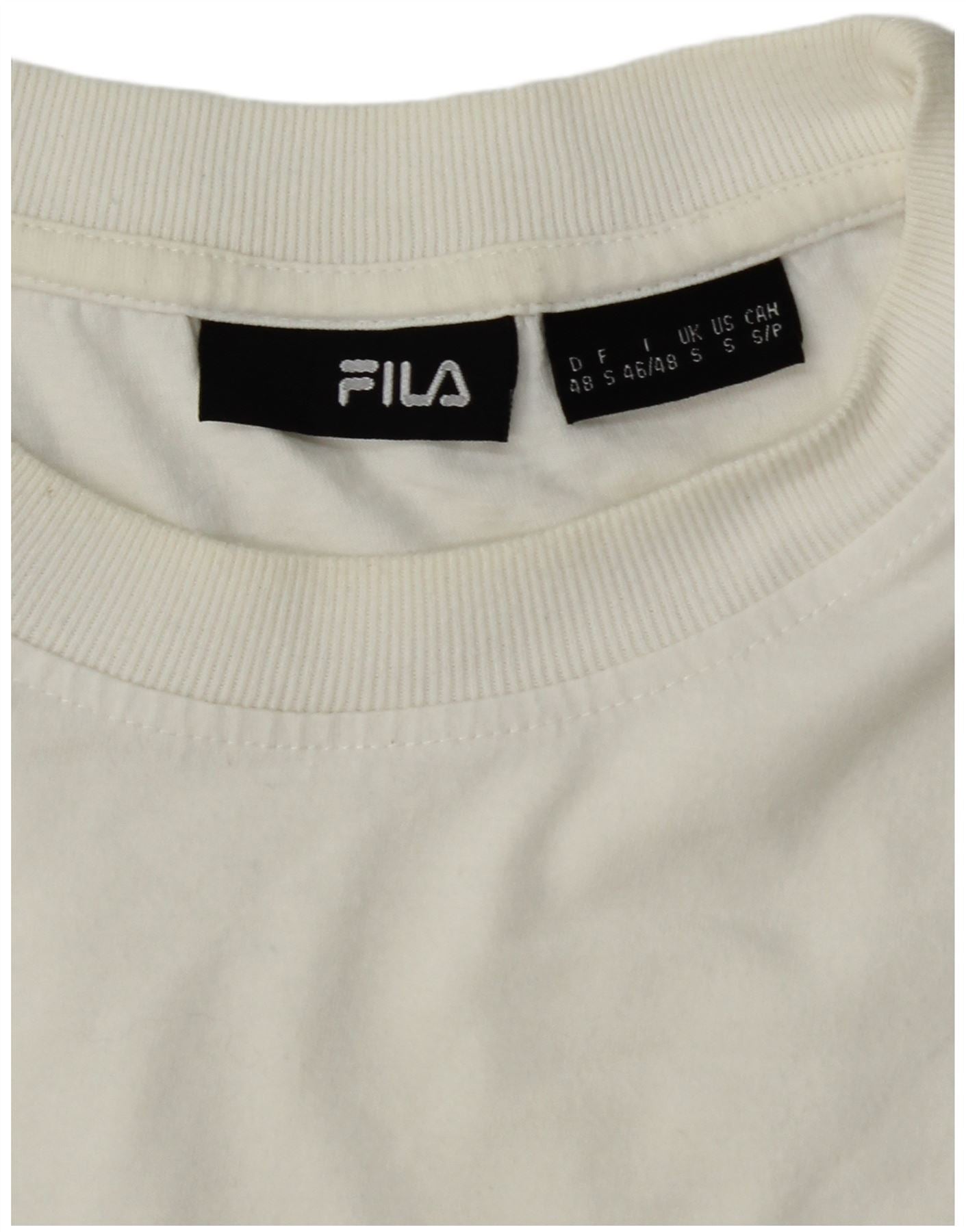 - AI Description: This Fila mens Graphic T-Shirt Top is crafted from soft off white jersey fabric. It features a classic round neck and short sleeves. The regular fit ensures comfort and ease of movement. A prominent Fila logo is displayed on the front. This pullover style is lightweight and breathable, perfect for sports or casual wear.