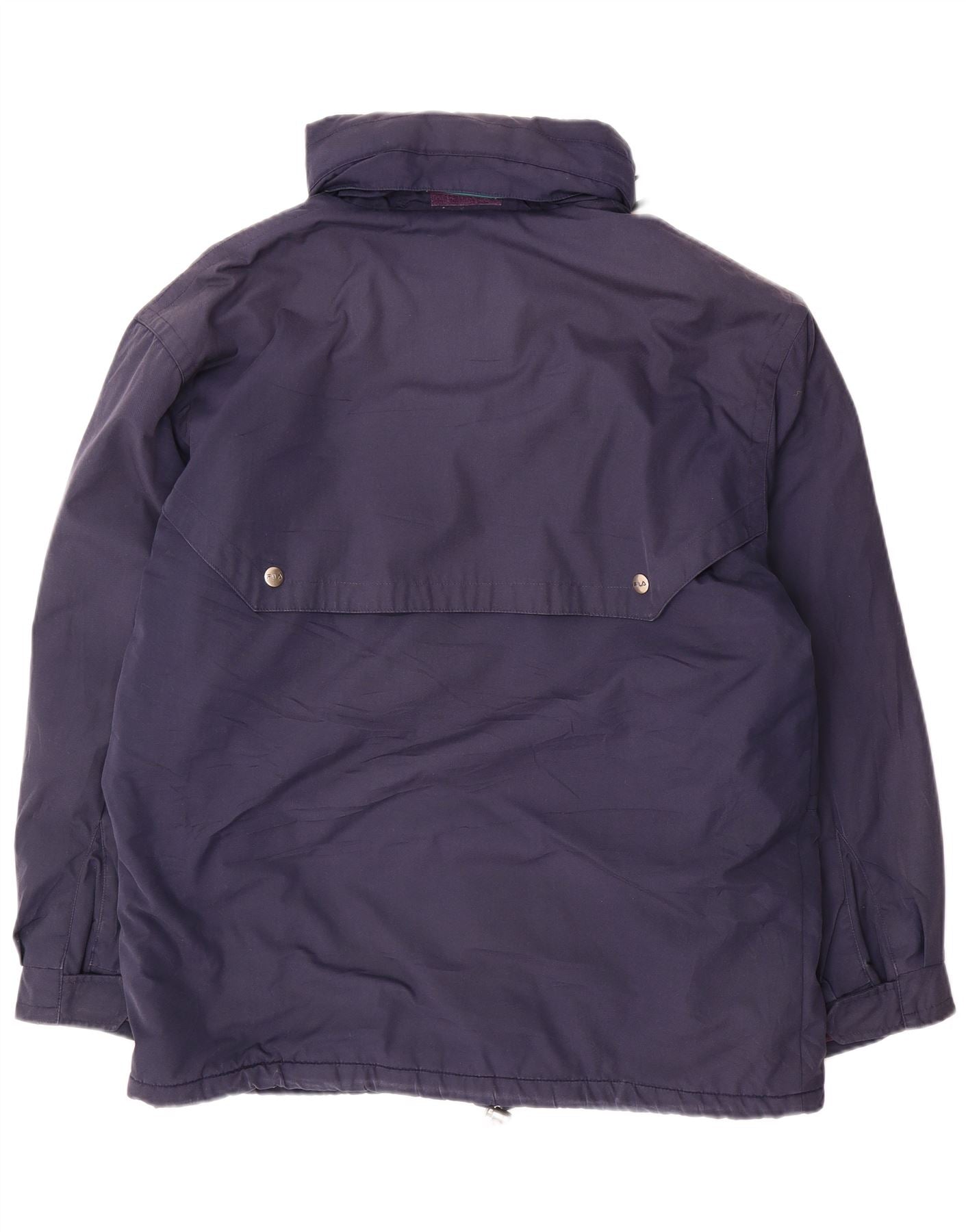- AI Description: This Fila mens windbreaker jacket is crafted from durable navy blue woven polyester. It features a high neck and a practical hooded design for protection. The full zip closure is complemented by button accents down the front. Long sleeves and a regular fit ensure comfort and ease of movement. Multiple pockets add functionality, making it windproof and ideal for outdoor activities.