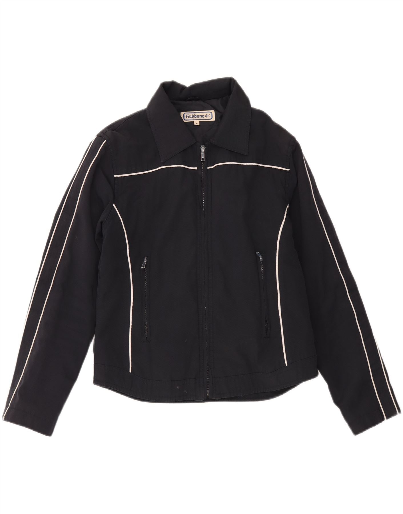 - AI Description: This Fishbone mens jacket is crafted from a durable black woven fabric. It features a collared neckline and a full zip closure. Long sleeves and a regular fit ensure comfort and ease of movement. Practical zipped pockets add functional detail to the design. This sports style jacket is ideal for active wear, offering a clean and versatile look.