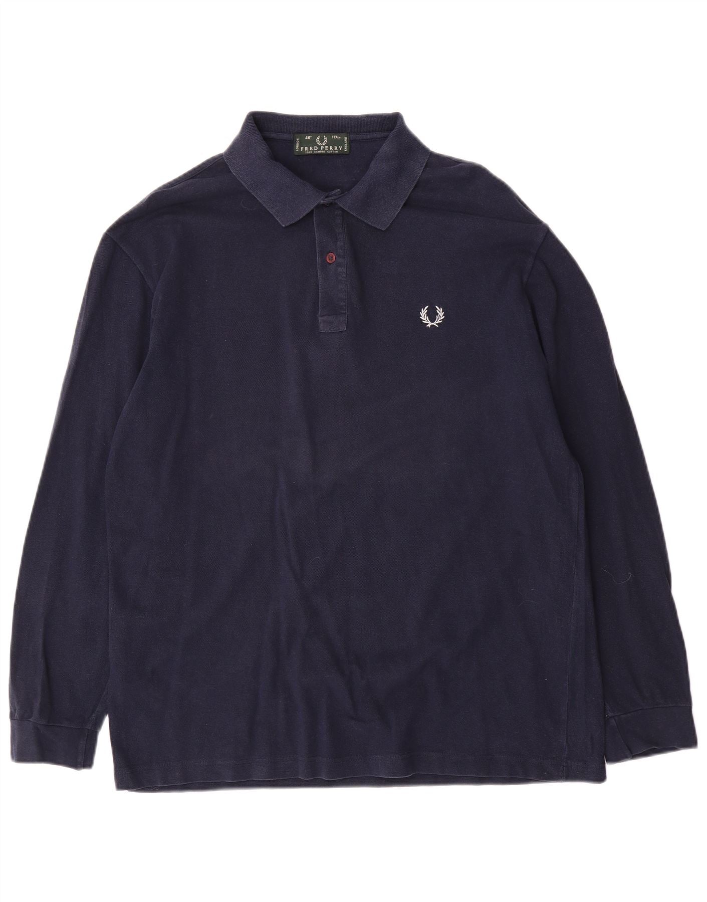 - AI Description: This Fred Perry mens long sleeve polo shirt is crafted from soft navy blue 100 percent combed cotton knit. It features a classic collared neckline and a button-up placket for a timeless look. The long sleeves and regular fit offer comfortable wear. An embroidered logo detail on the chest adds a signature touch. This classic style is both breathable and comfortable.