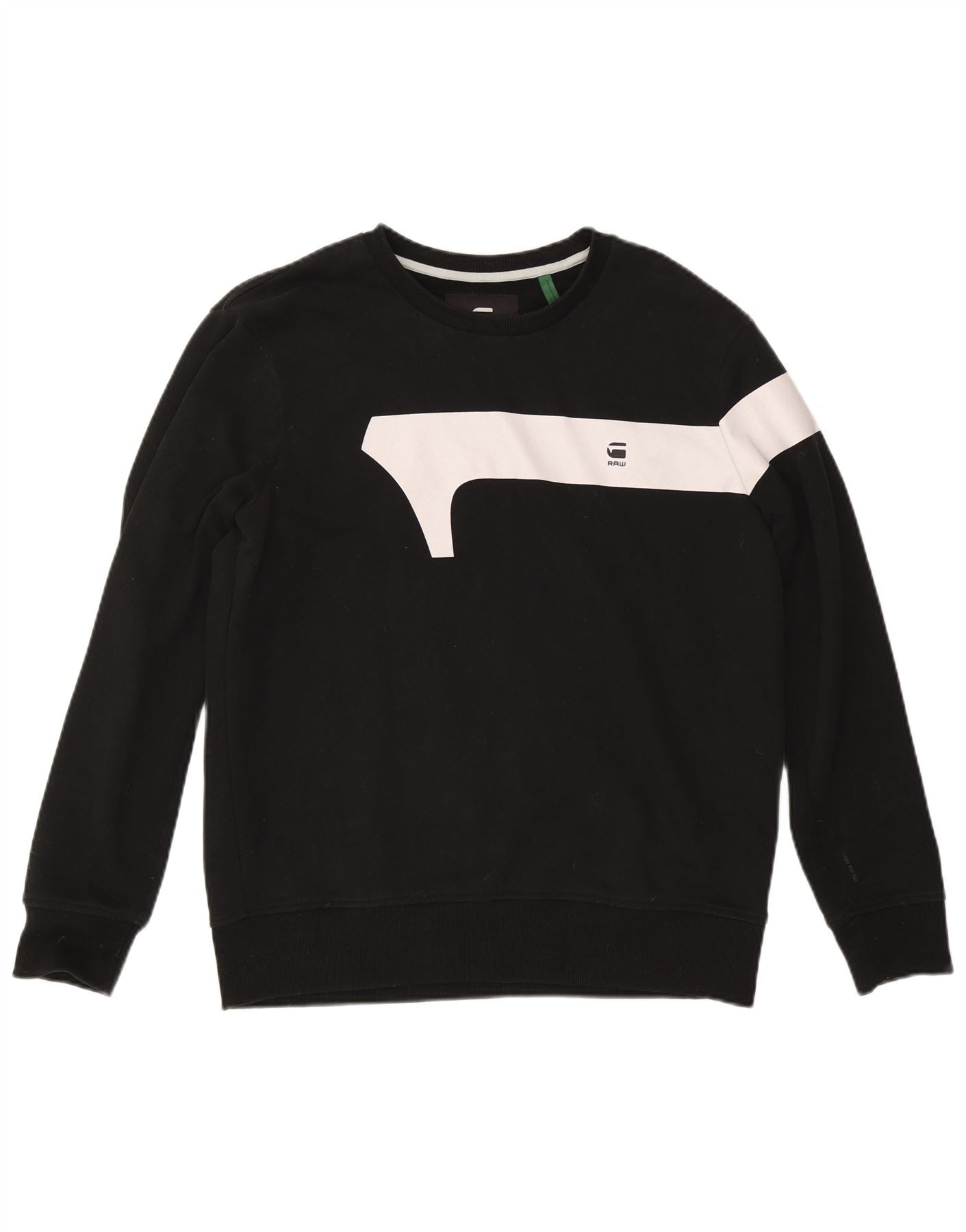 - AI Description: This G-Star Raw mens sweatshirt jumper is crafted from soft black 100 percent cotton knit fabric. It features a classic round neck and long sleeves. The pullover design offers a comfortable regular fit. A distinctive white colourblock graphic with the brand logo adorns the front. This modern style provides both comfort and a contemporary look.