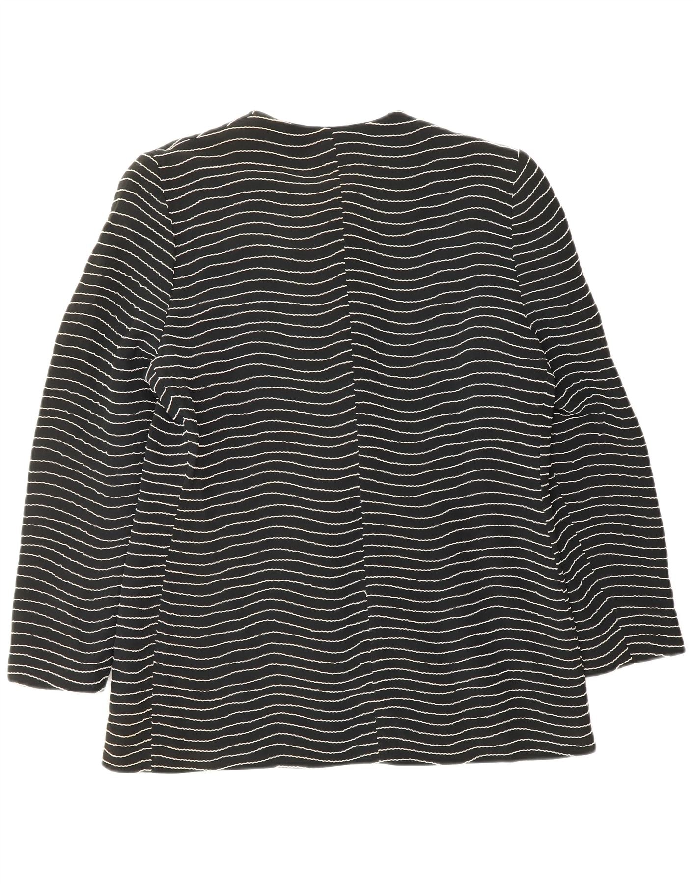 - AI Description: This Gai Mattiolo womens blazer jacket is crafted from a black woven fabric. It features a distinctive geometric pattern of wavy lines across the body and long sleeves. The classic round neck design offers a sophisticated silhouette. Seven ornate beaded buttons provide a striking front closure. This regular fit jacket combines structured tailoring with unique visual detailing, perfect for an elegant ensemble.