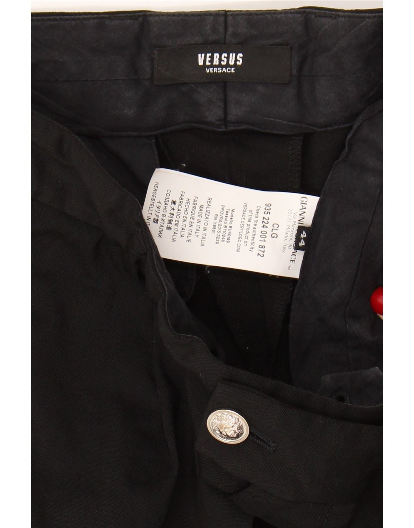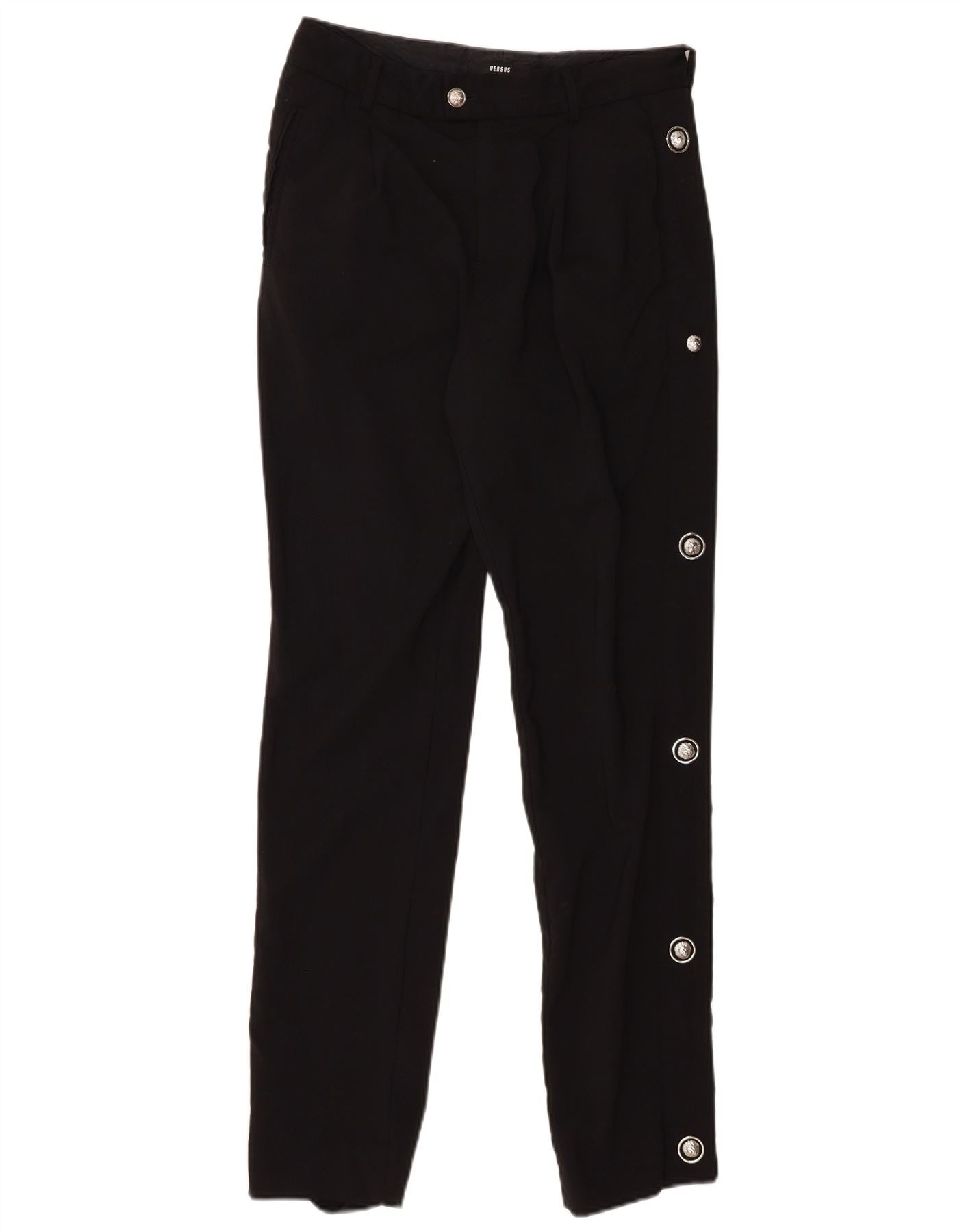 - AI Description: These Versus Versace womens trousers are crafted from a quality black woven fabric. They feature a regular fit with a straight leg silhouette. The button closure ensures a neat front. Practical pockets add functionality. Tonal button accents complete the refined design, offering a sophisticated and versatile wardrobe staple.