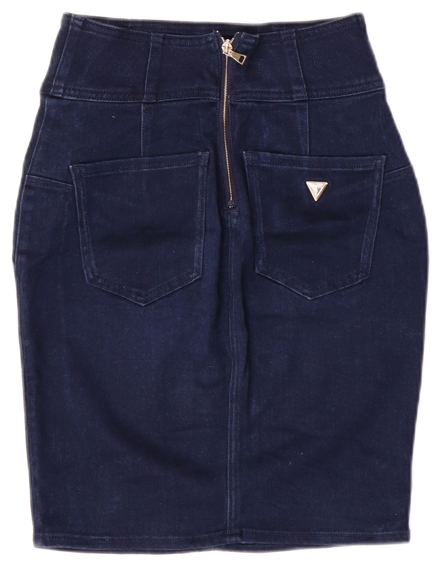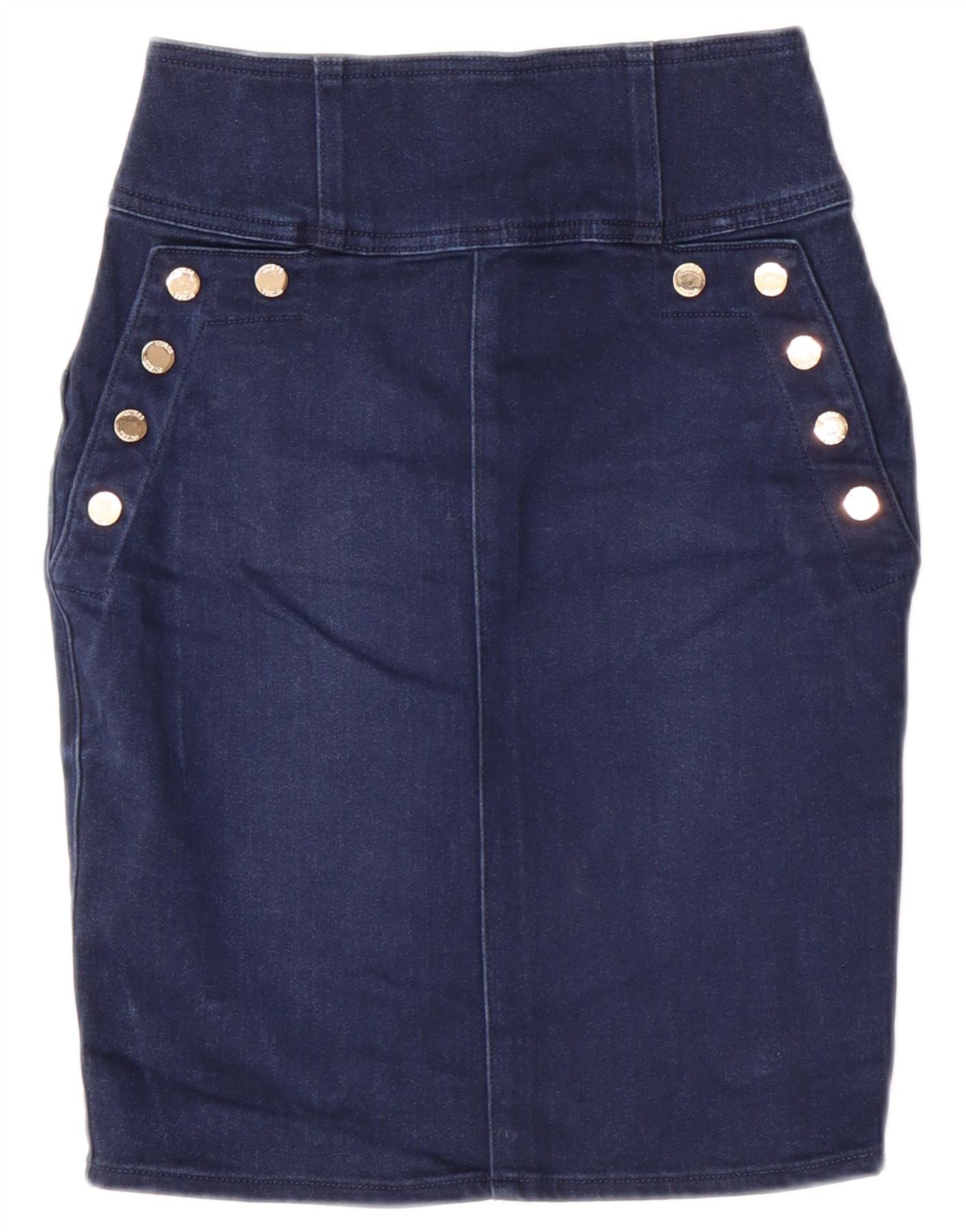 - AI Description: This Guess women's denim skirt is crafted from a cotton blend with a smooth finish. The slim fit and classic cut create a flattering silhouette. It features a zip closure and decorative button accents on the front pockets. The dark blue denim offers a timeless, versatile look. Rear pockets and a subtle logo detail complete the design.