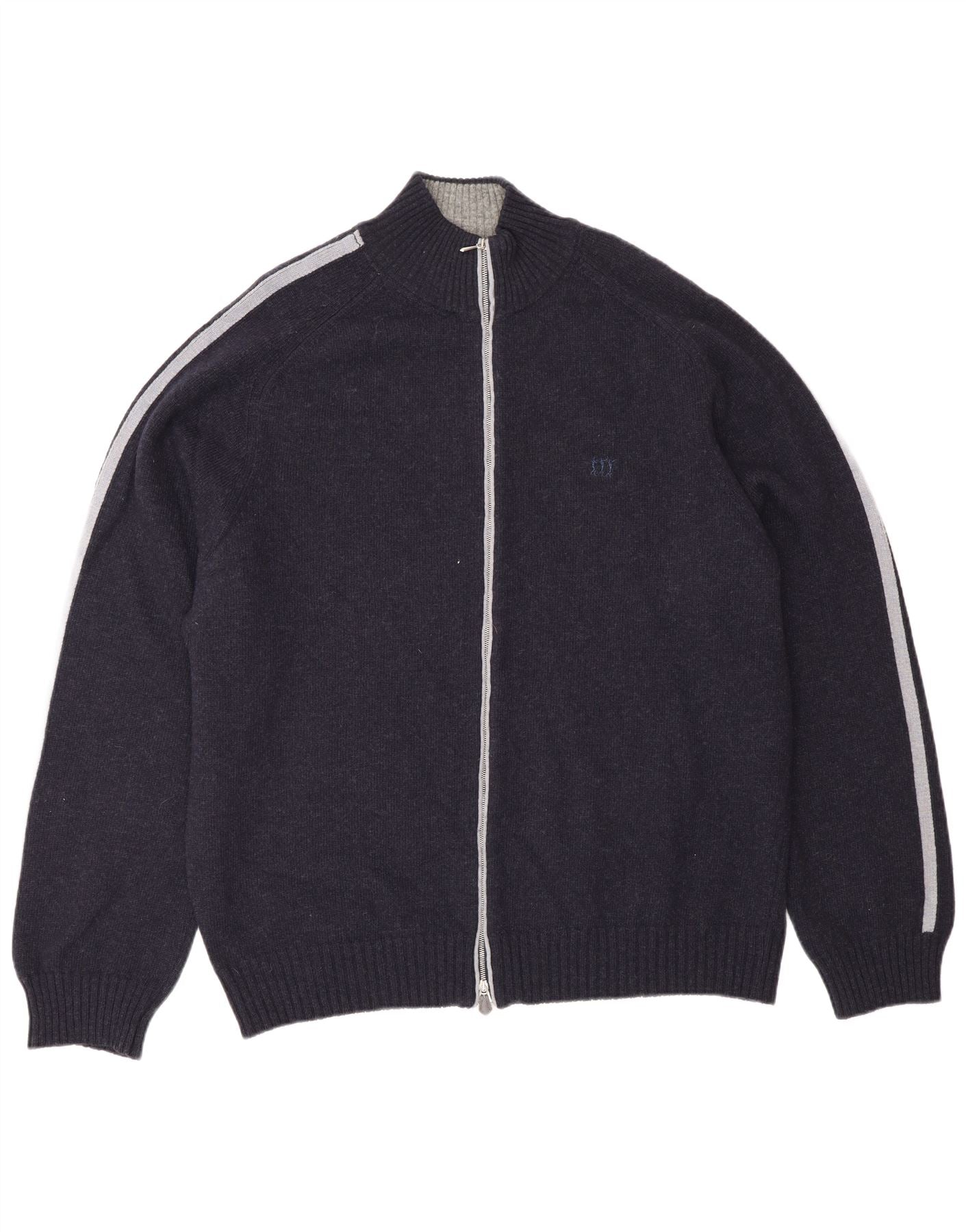 - AI Description: This Henry Cottons mens cardigan sweater is crafted from 100 percent pure new wool, offering a luxurious knit texture. It features a rich navy blue hue with distinctive grey stripes along the long sleeves. The collared neckline and full zip closure provide a classic, versatile look. A regular fit ensures comfortable wear. This piece combines warmth with sophisticated style, perfect for layering.